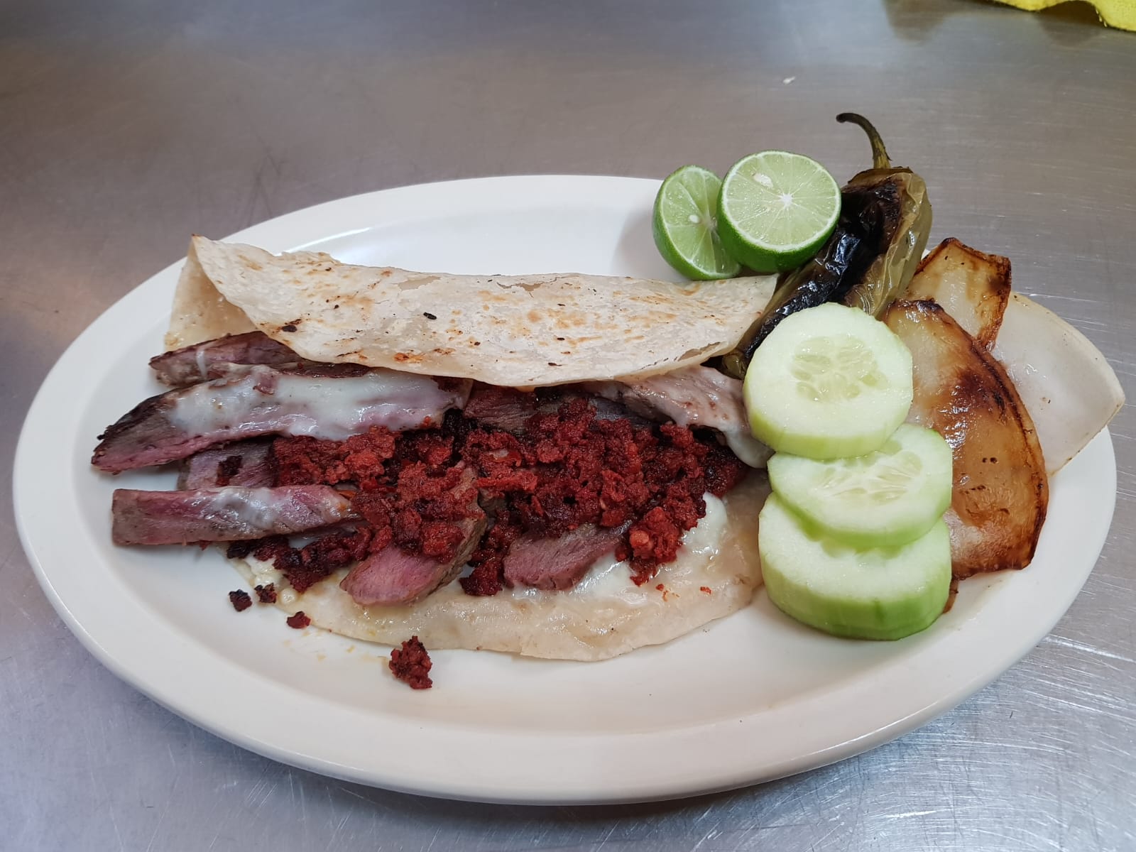 200 te. arrachera marinada, costilla rib eye, frijoles charros, cebollitas asadas, tortillas hechas a mano. Nota pesada en crud