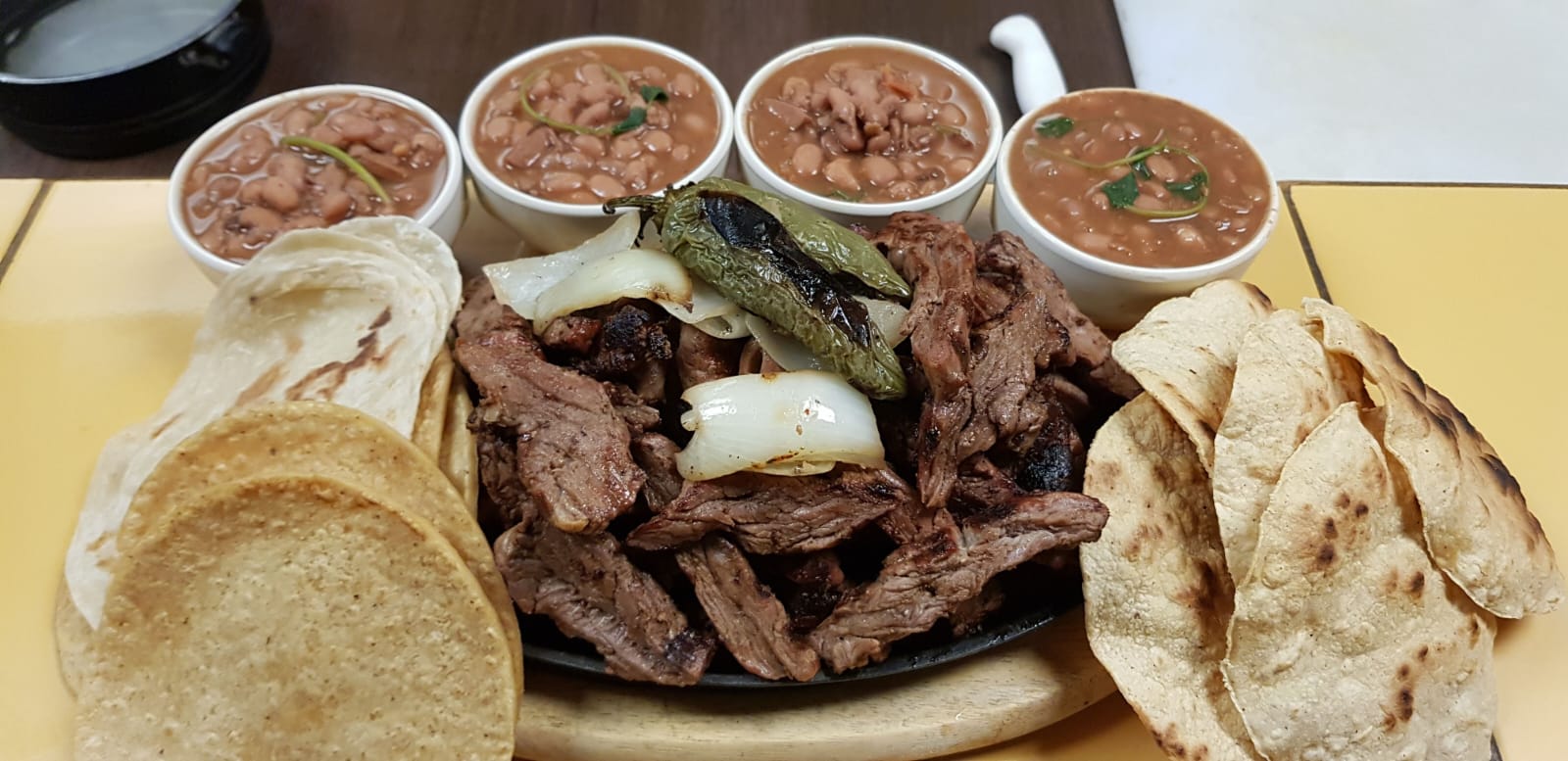 Arrachera. Todas las opciones incluyen salsas, verduras, cebollitas, chiles asados, frijoles charros y tortillas hechas a mano.