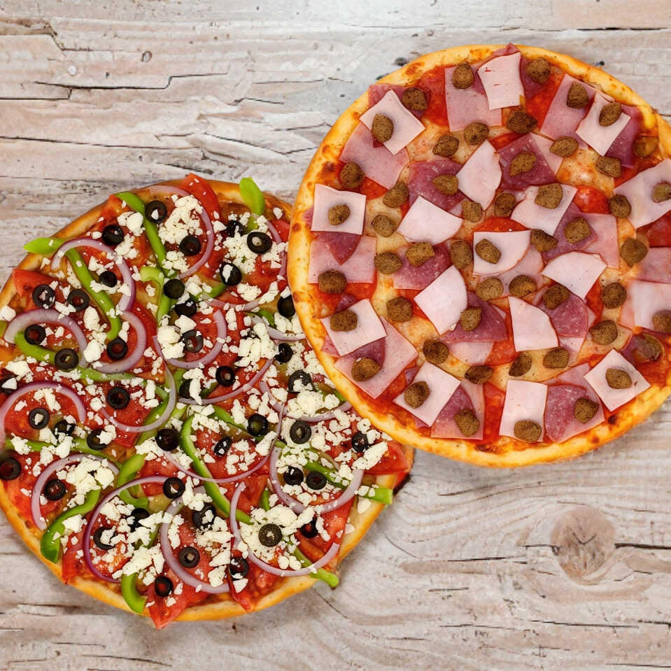 Escoge tu preferida hasta 4 sabores en dos pizzas.