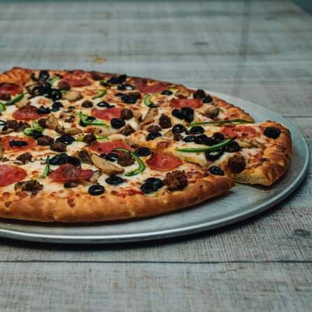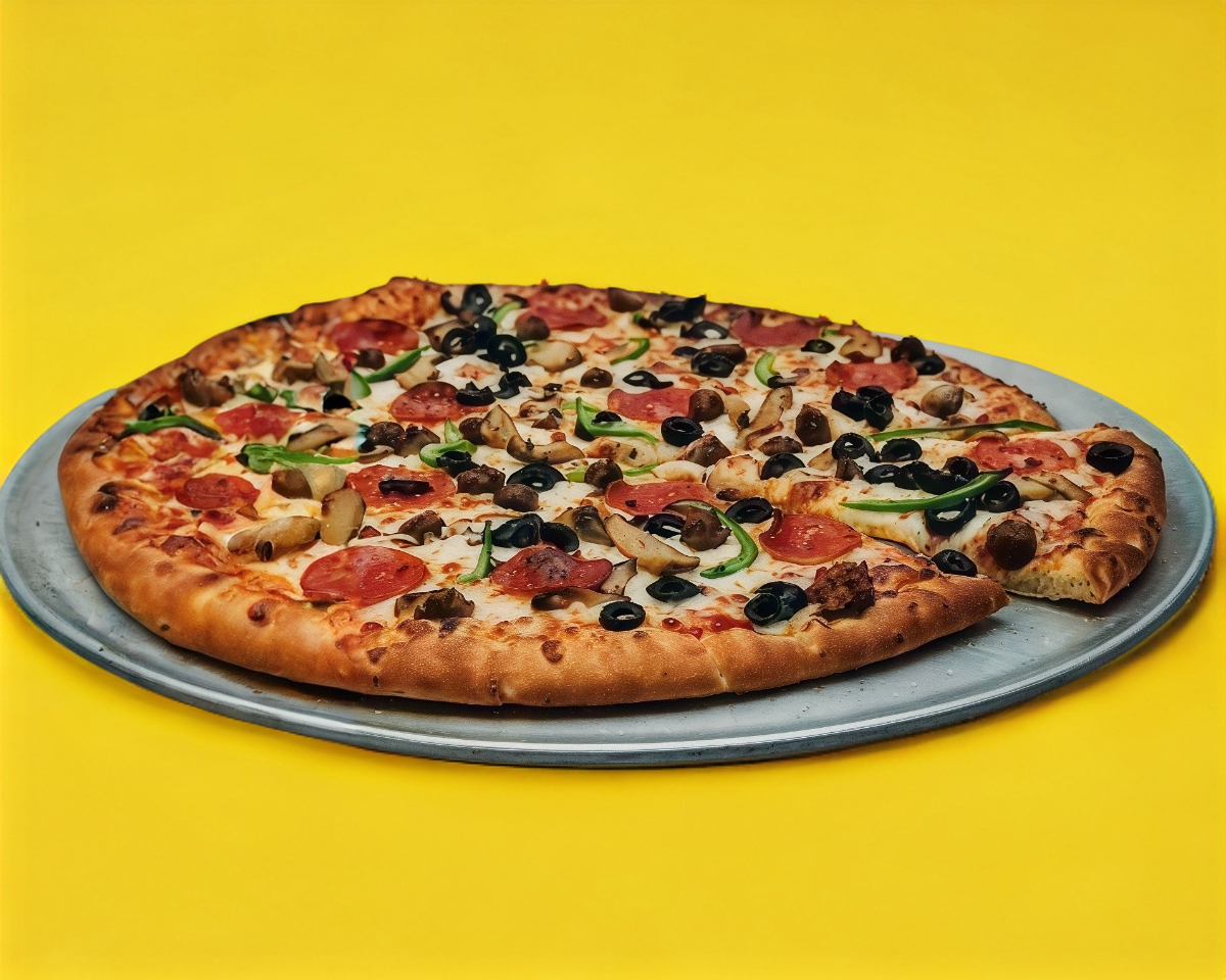 Masa de la casa, salsa de tomate, queso mozarella, peperoni, jamón, aceitunas, champiñones y morrón.