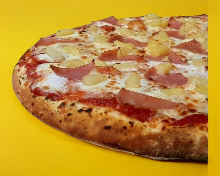 Masa de la casa, salsa de tomate, queso mozzarella y piña.