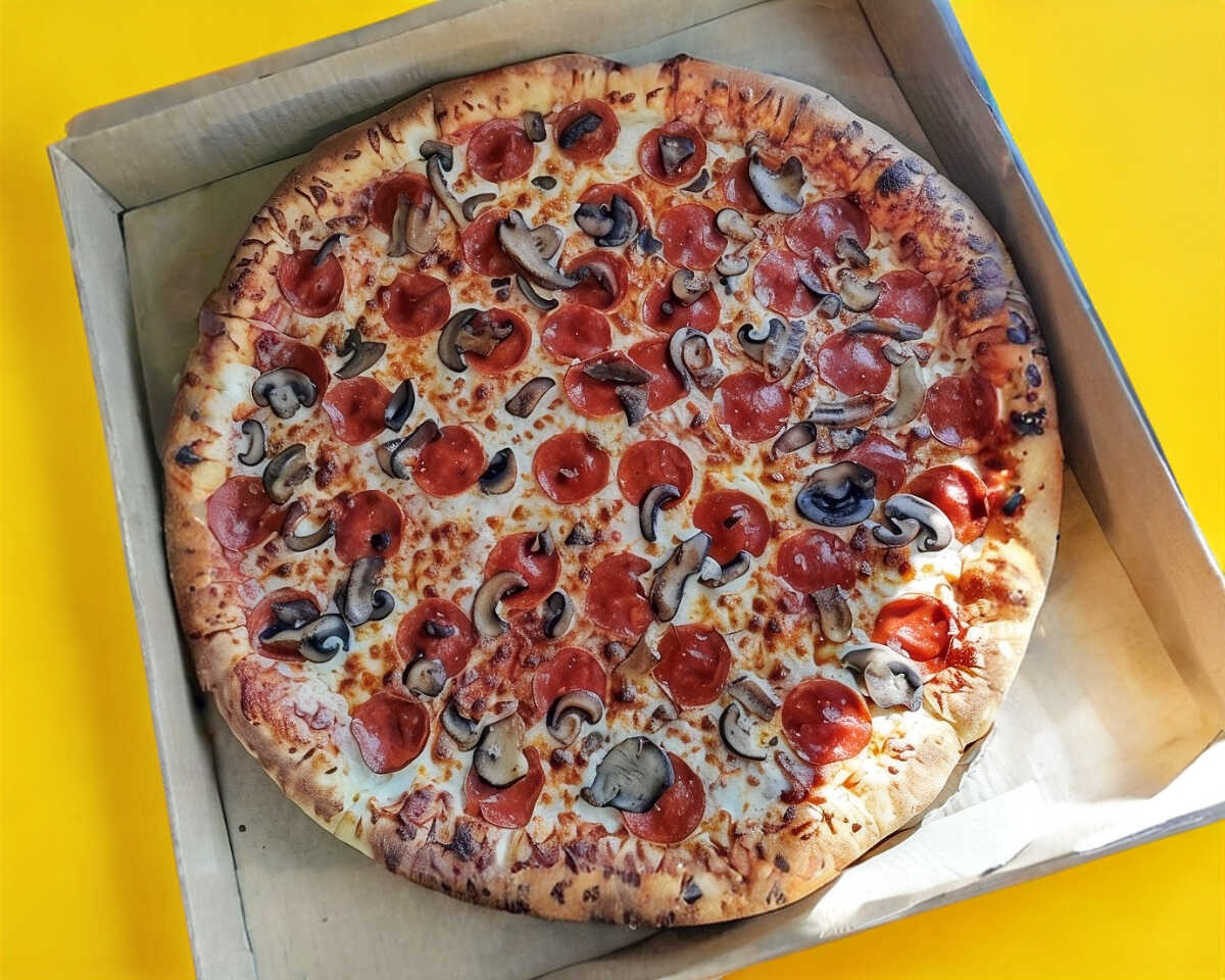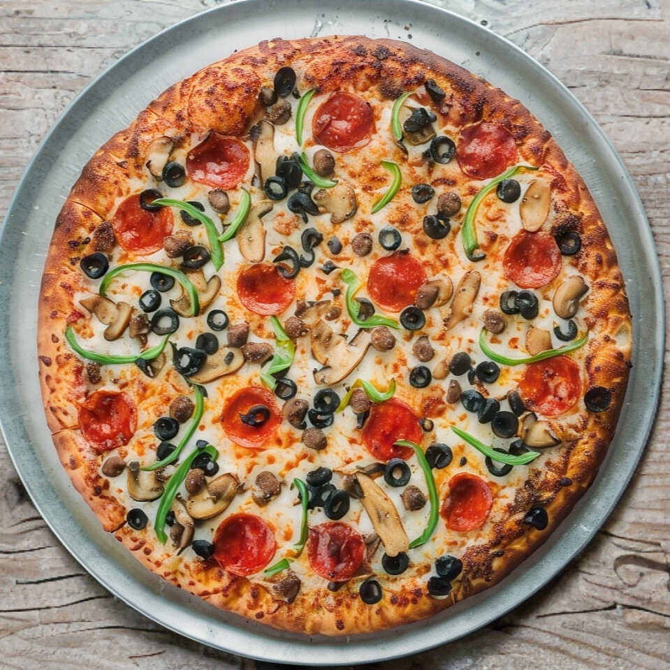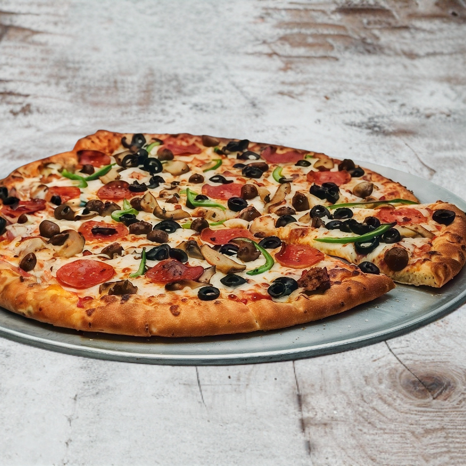 Masa de la casa, salsa de tomate, queso mozarela, peperoni, salchicha italiana aceituna, champiñones y morrón.