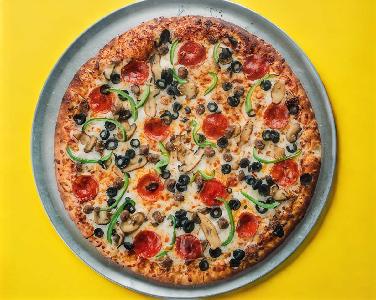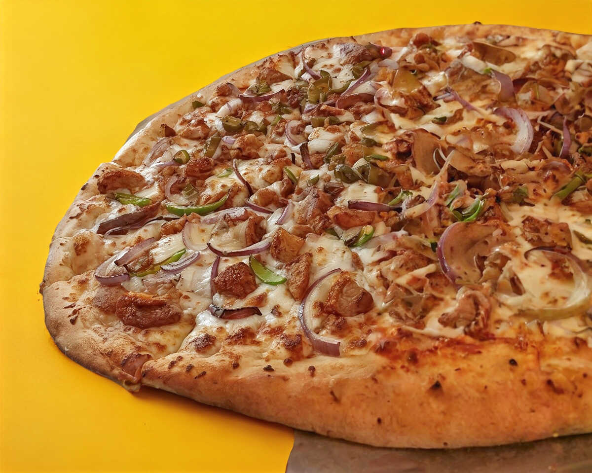 Varios quesos, pepperoni, salchicha italiana, chile morrón, aceituna negra y champiñones.