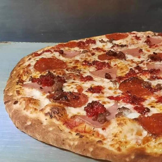 Masa de la casa, salsa de tomate, queso mozzarella, peperoni, jamón, chorizo y salchicha italiana.