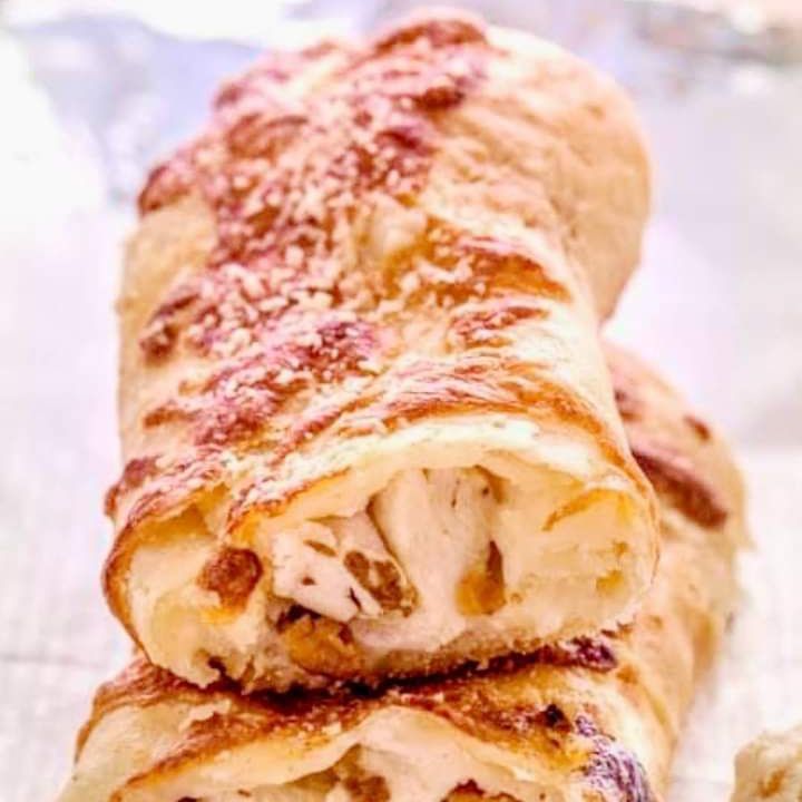 Rollo relleno de pechuga de pollo con jamón y salsa.o puedes escoger un sabor de pizza