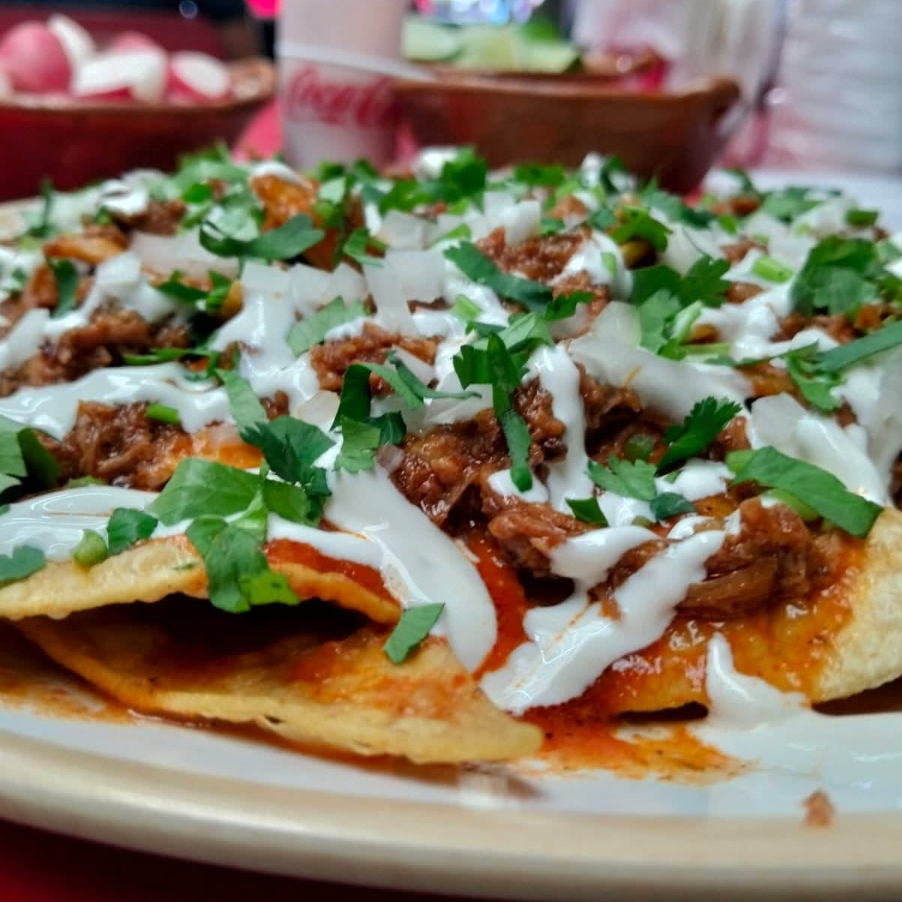 Totopos remojados en salsa de chilaquiles de la casa con consomé, crema, queso manchego, cilantro y cebolla