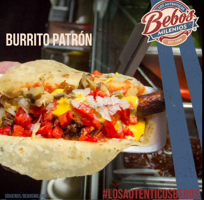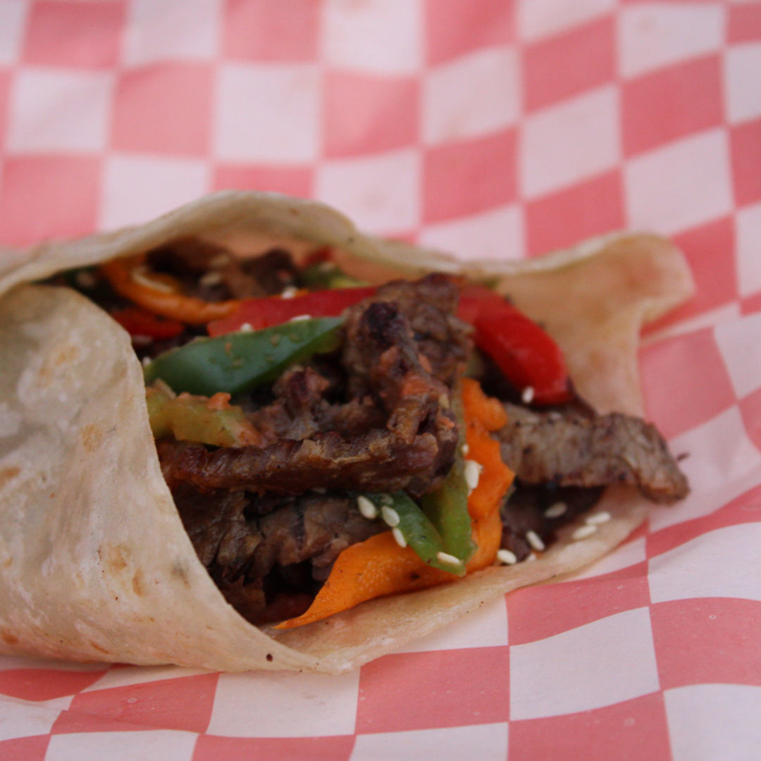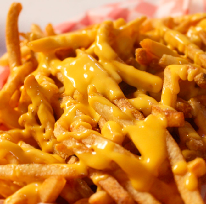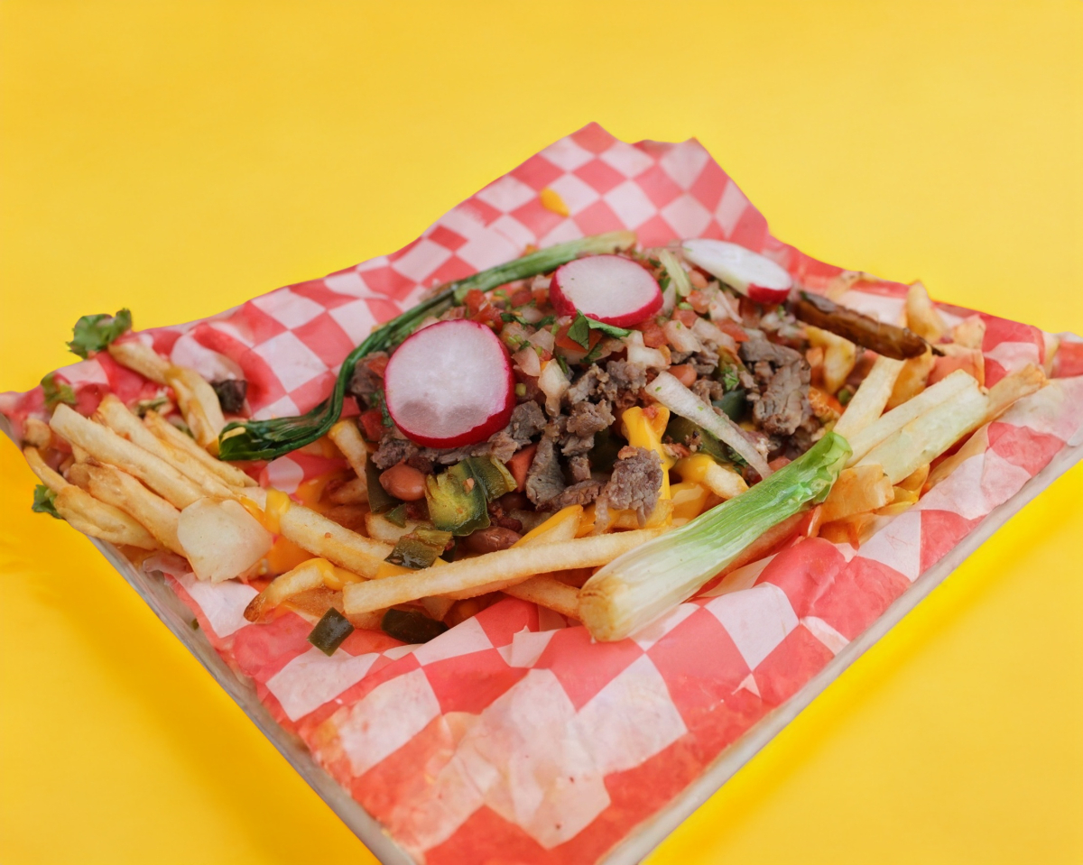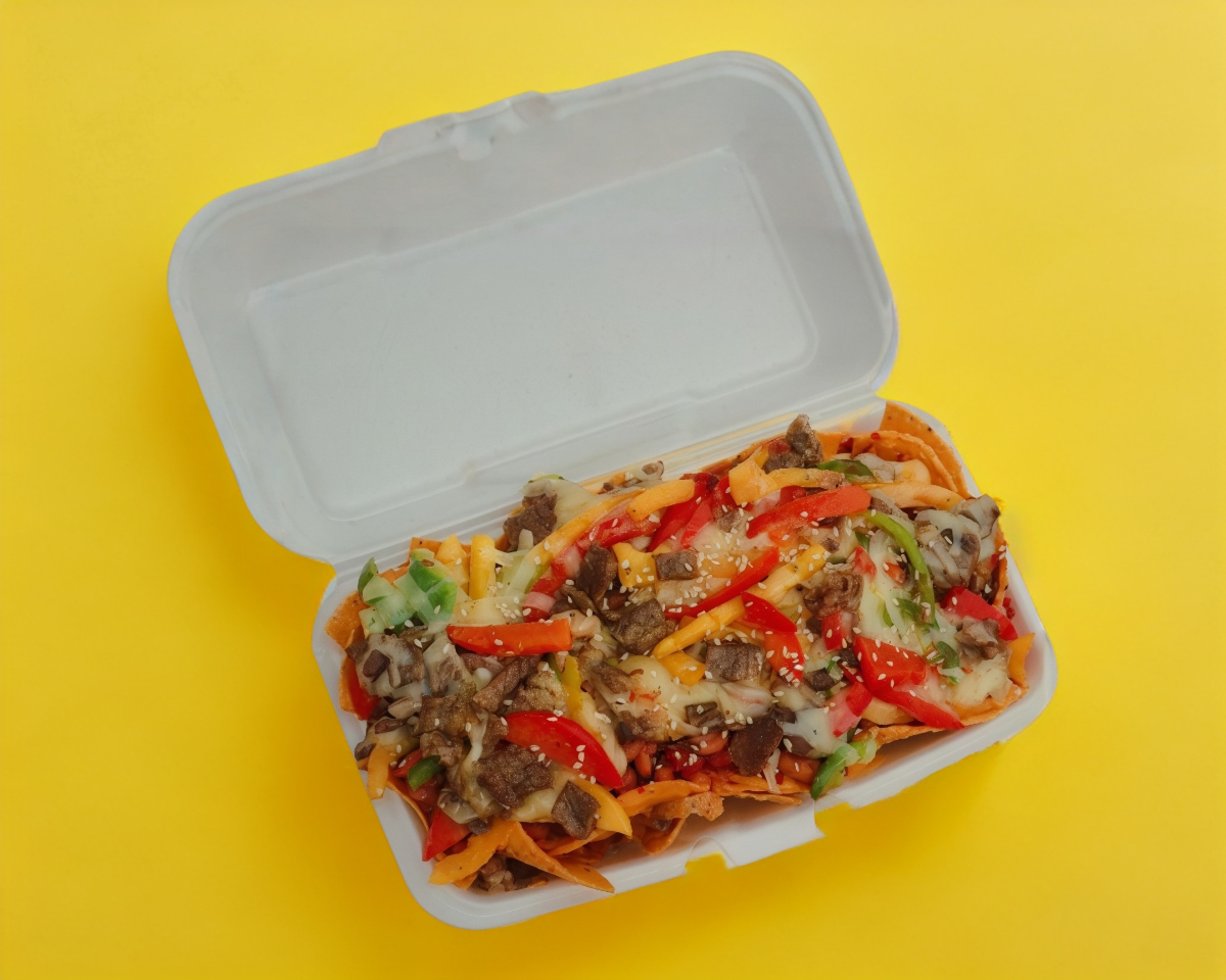 Carne asada o pollo, morrones, queso fundido y queso amarillo.