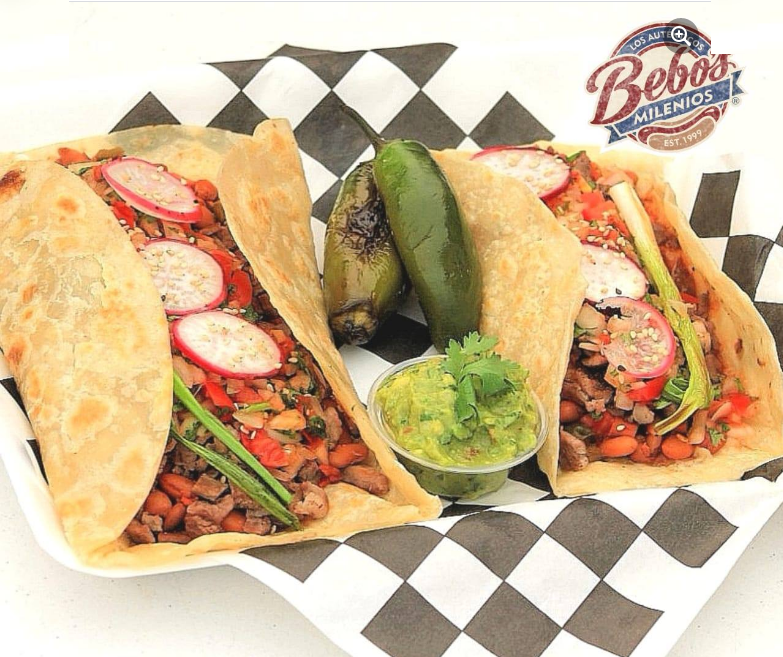 Carne asada, Frijol al gusto, salsa bandera, rabano y cebollita cambray asada