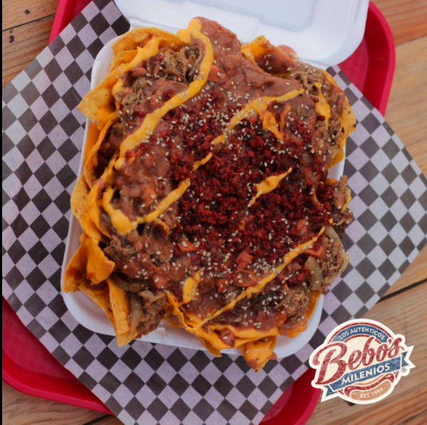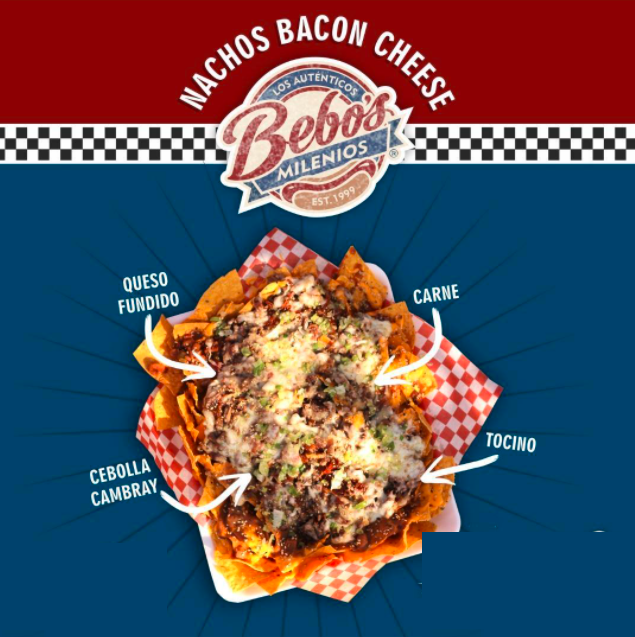 Carne asada, tocino, queso fundido y cebolla de cambray.