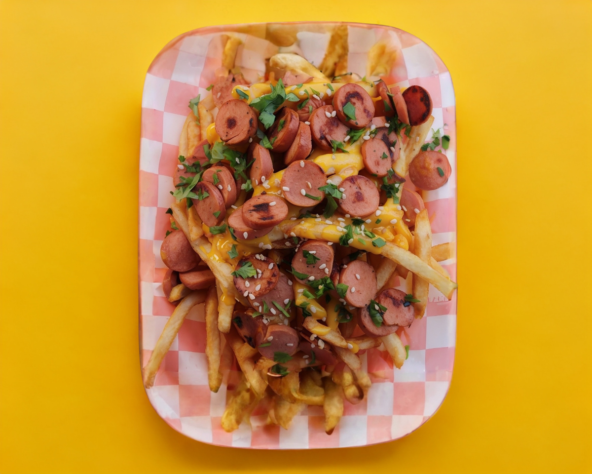 salchichas, piña, aceituna negra, salsa ragu, queso fundido.
