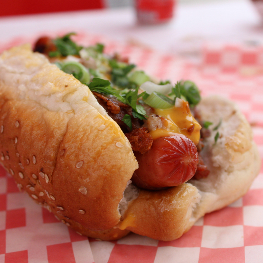 2 salchichas, carne, tocino, queso fundido y cebolla de cambray