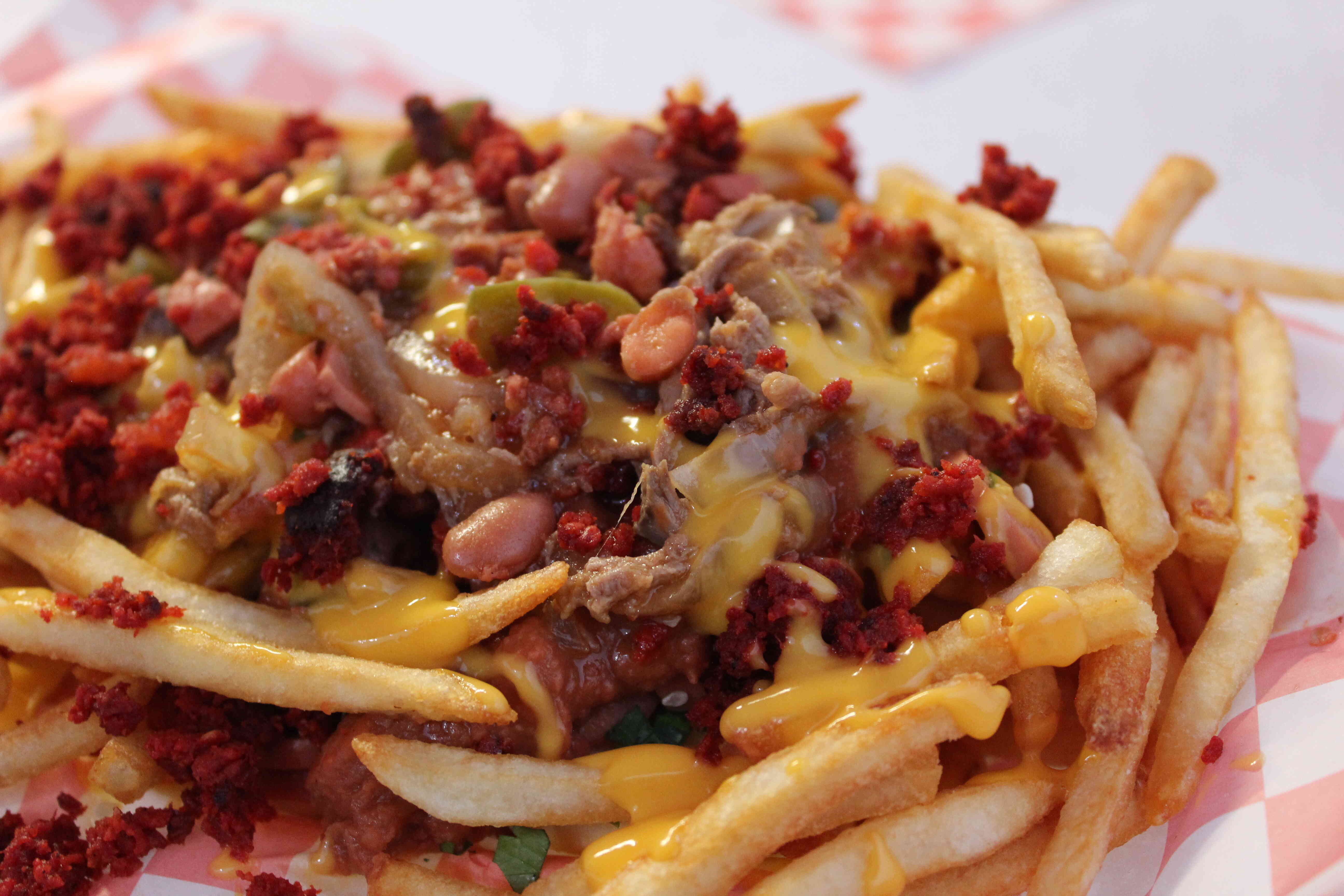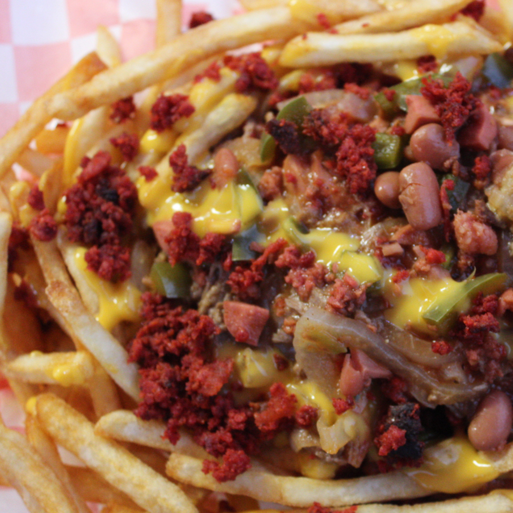 Grande, 2 salchichas, frijol cubano, frijol puerco, frijol natural, chorizo, carne deshebrada c/cebolla y queso amarillo