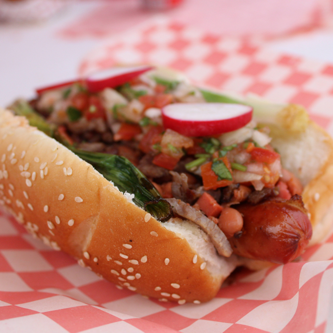 salchicha, carne asada, Frijol al gusto, salsa bandera, rabano y cebollita cambray asada