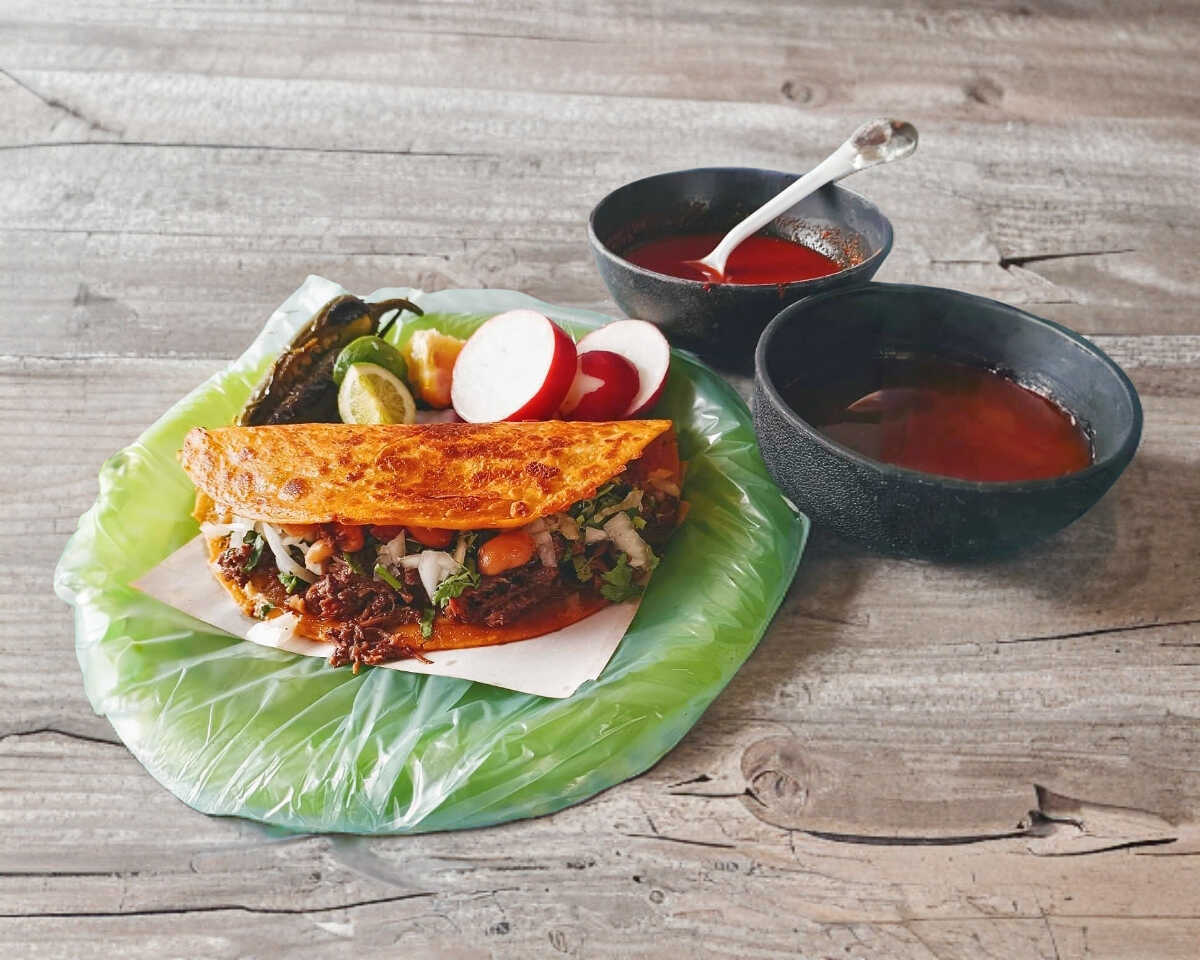 3 Quesabirrias compuesta por tortilla de maíz con queso y carne, 1 bebida y consomé de 12 onzas.