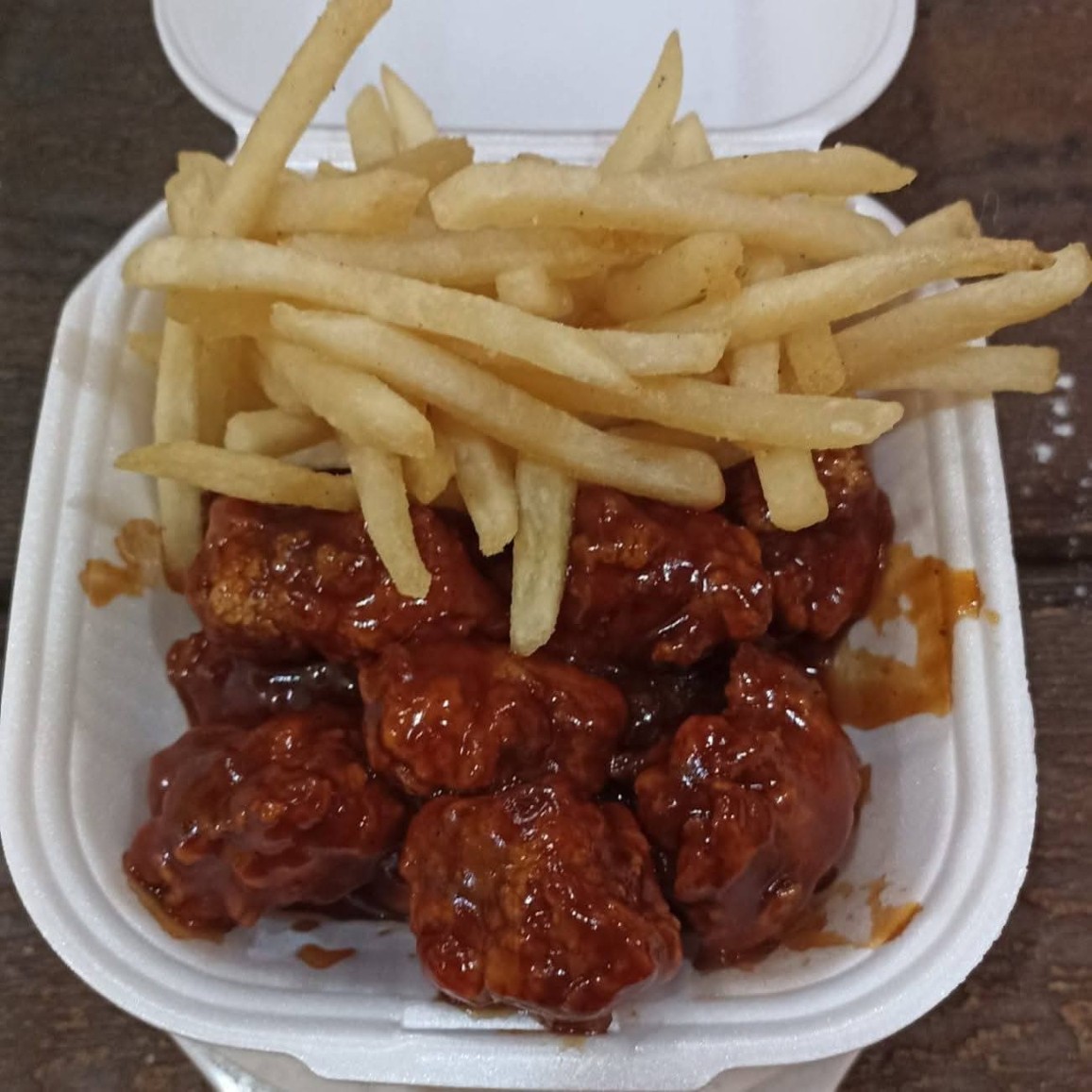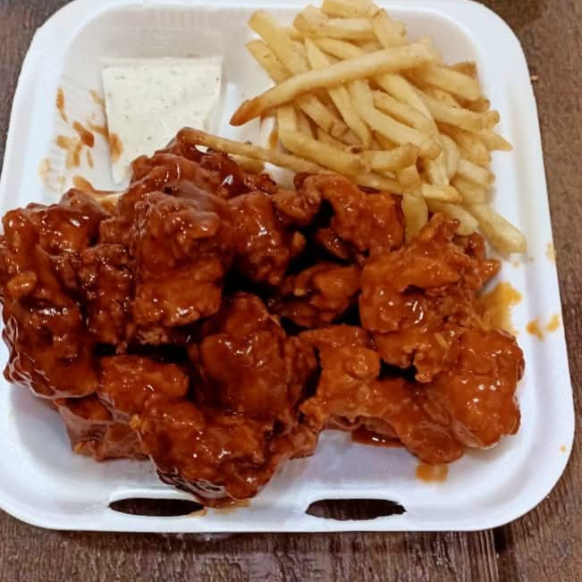 BONELES EN SALSA BBQ CON PORCI0N DE PAPAS