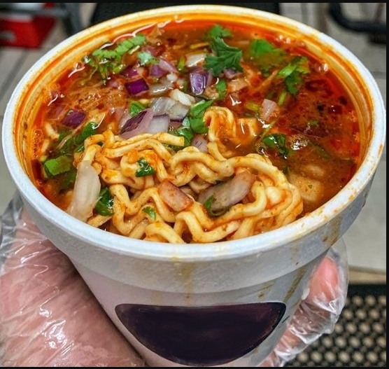 Deliciosa pasta tipo Maruchan , Cocinada en juguito de Birria con Carne y Queso.