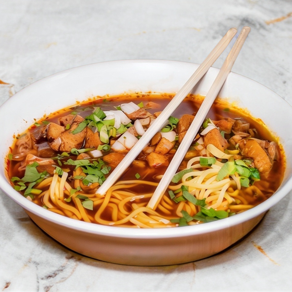 Pasta Ramen cocida con juguito de birria y trozos de chicharron