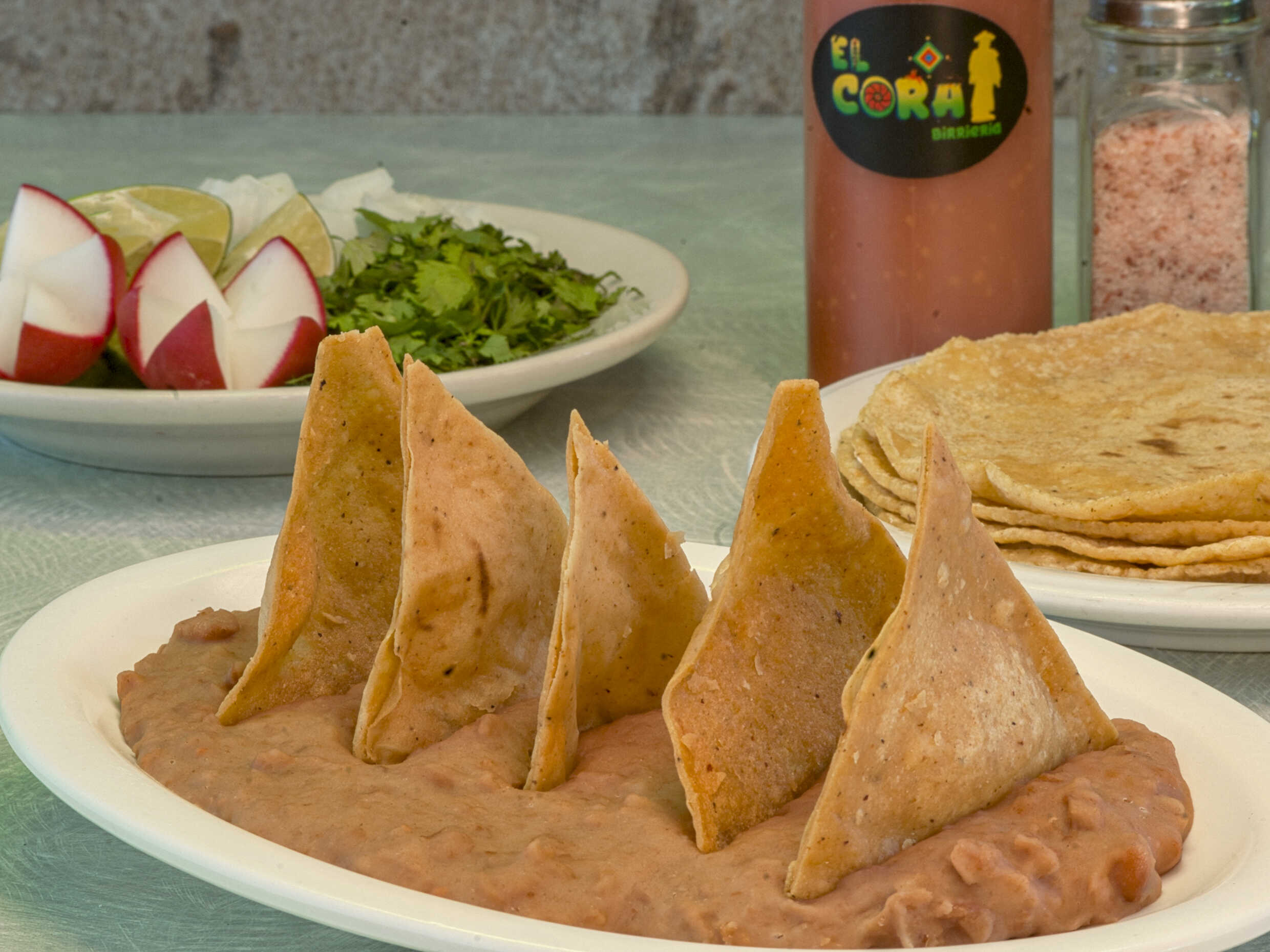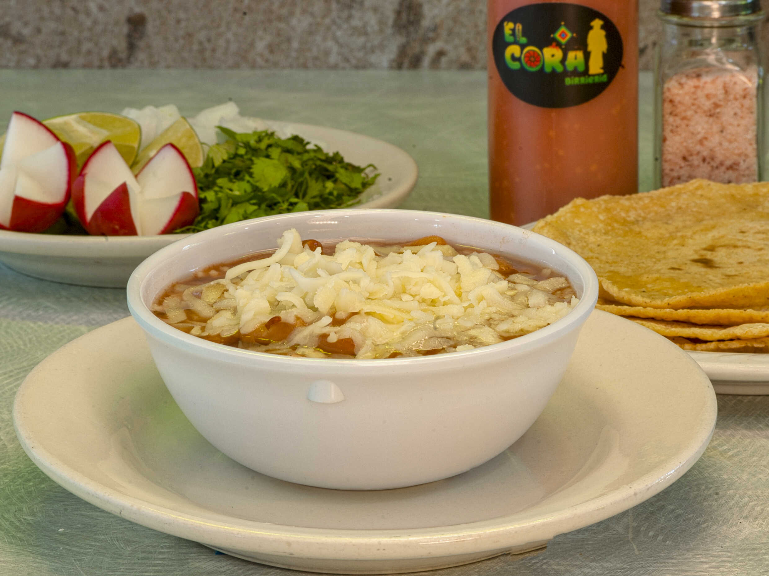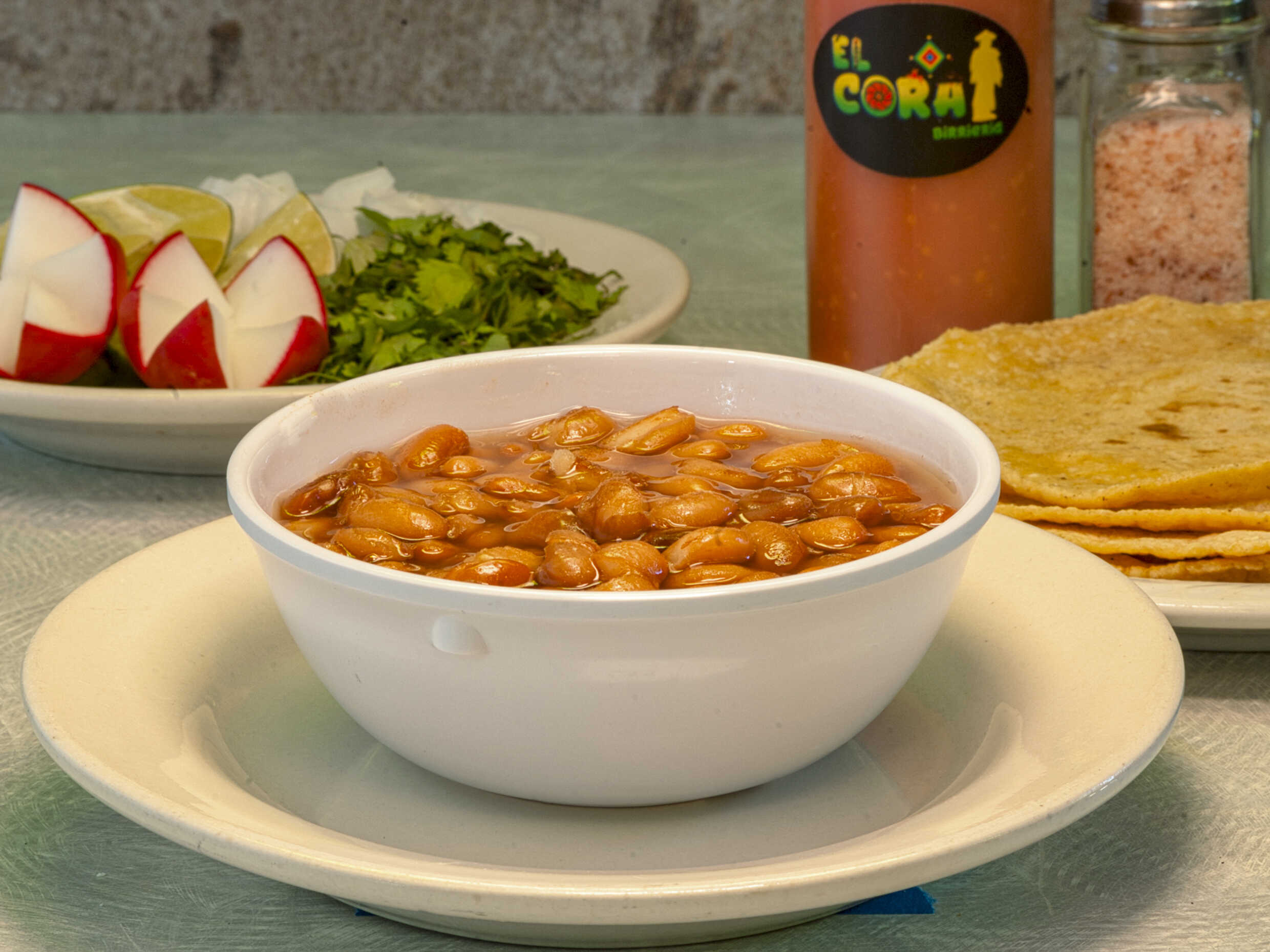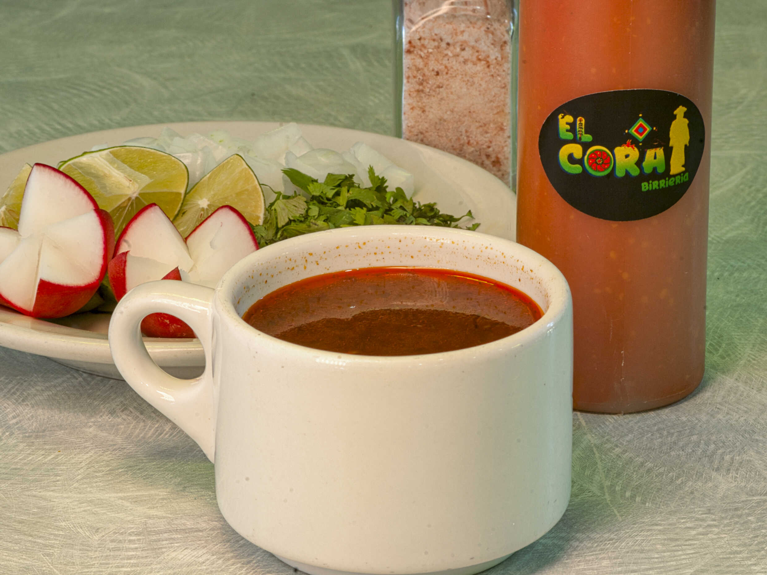 en vaso de 32 oz acompañado con verduras, salsa y 6 tortillas.