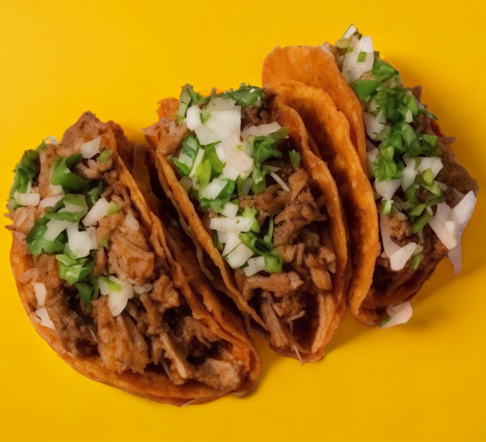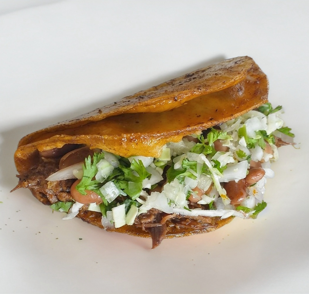 Tortilla normal, acompañado de cebolla, cilantro, salsa, verdura y limón.