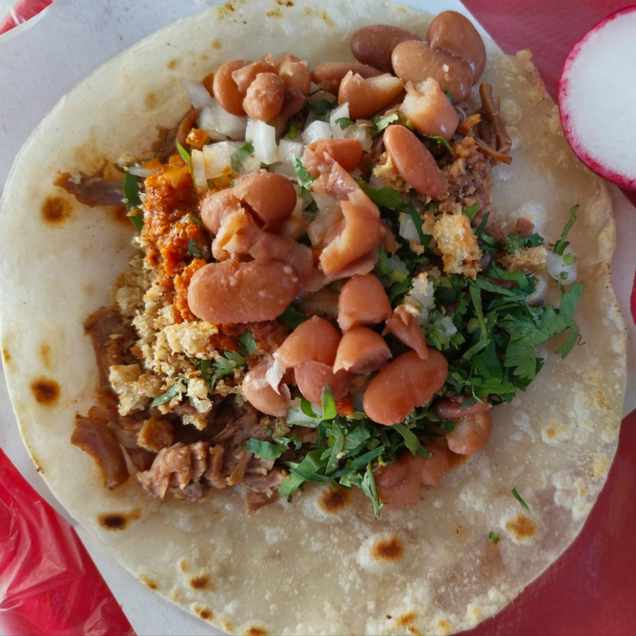 Tacos dorados de maiz, verdura, salsa, chicharrón y frijoles