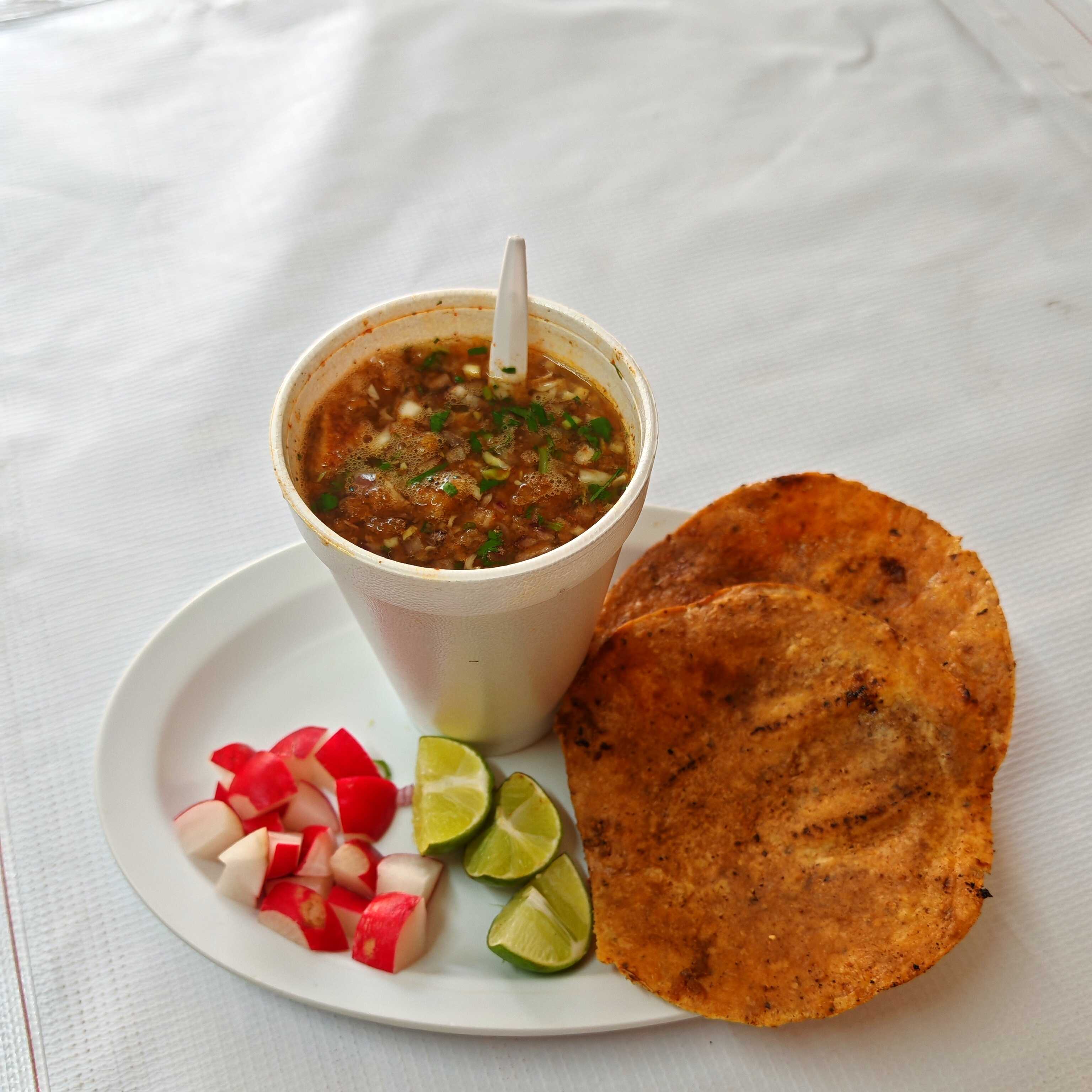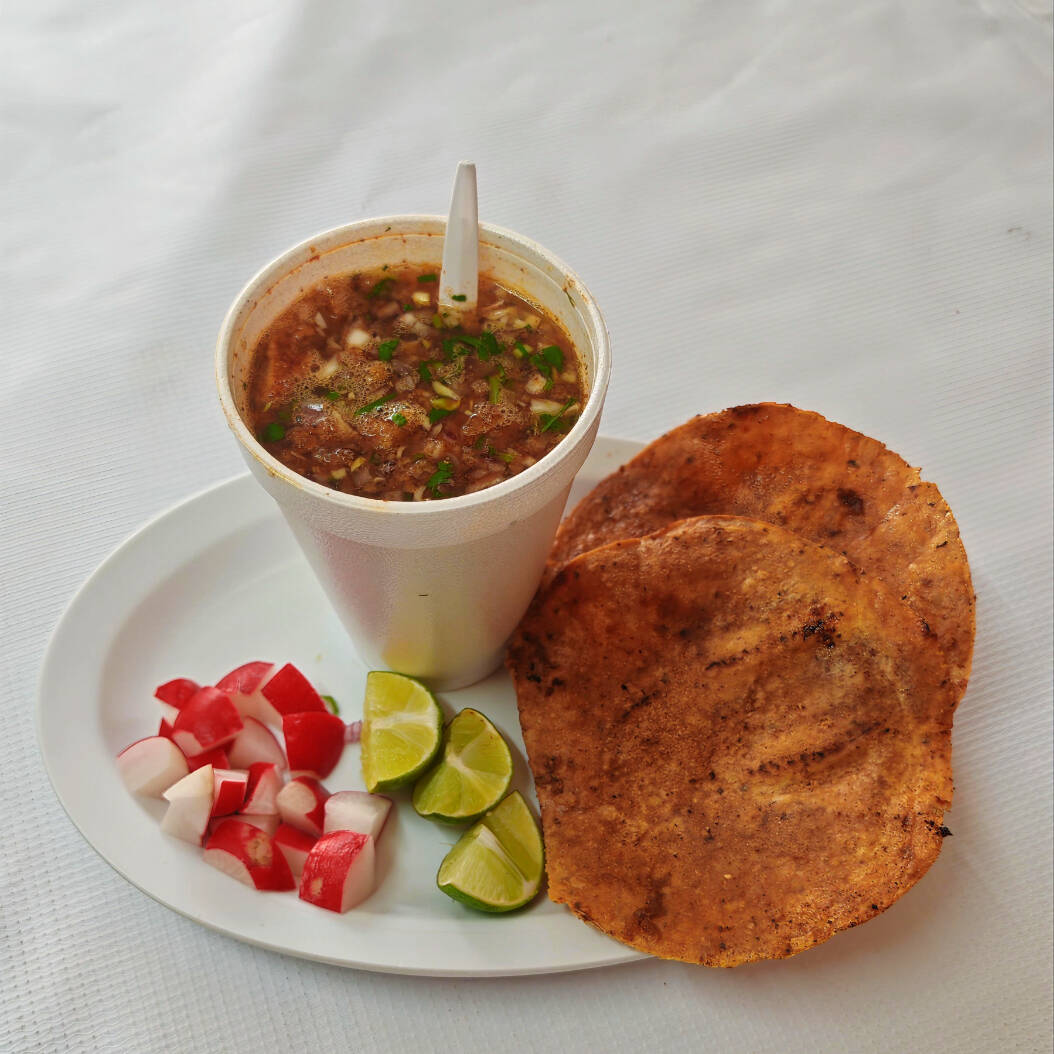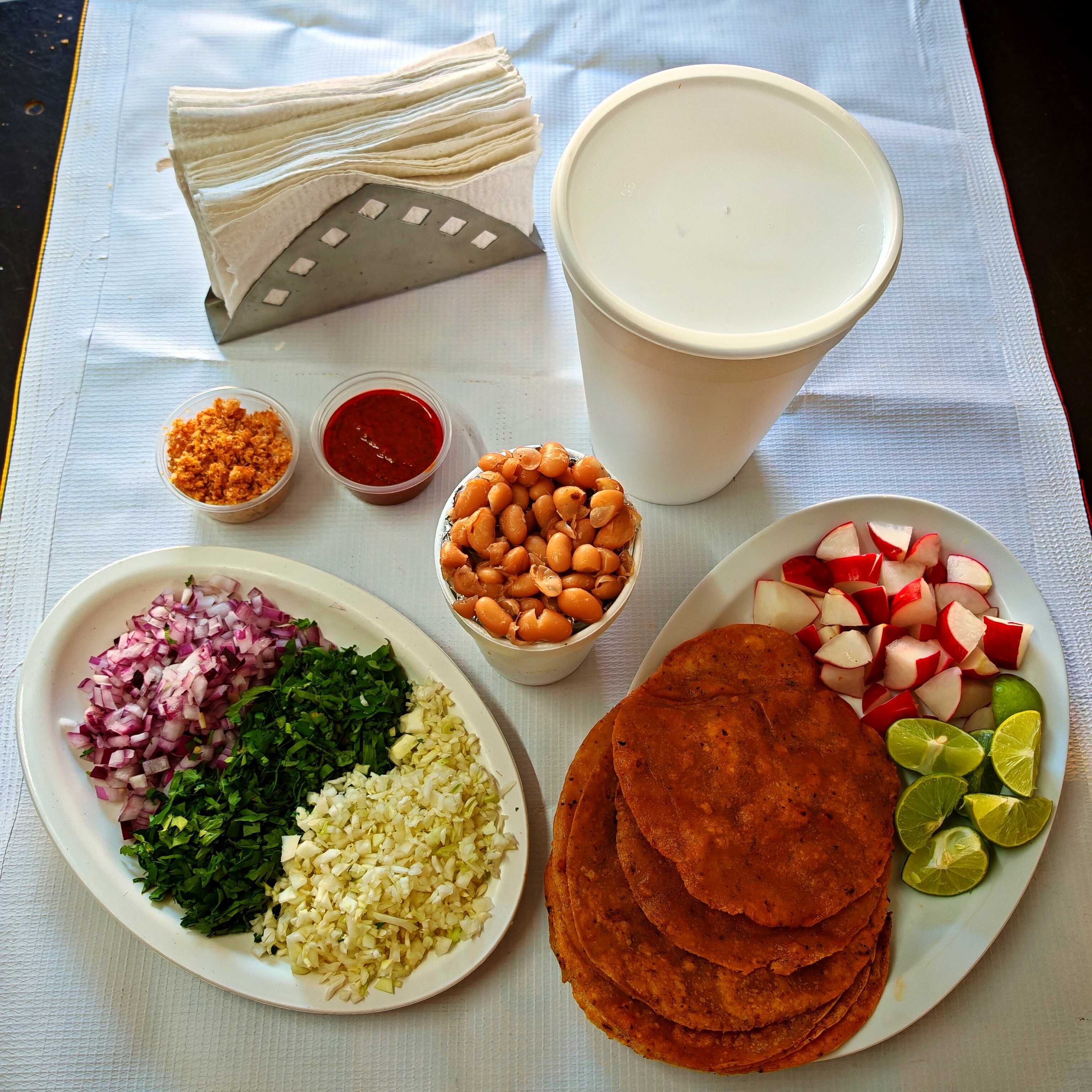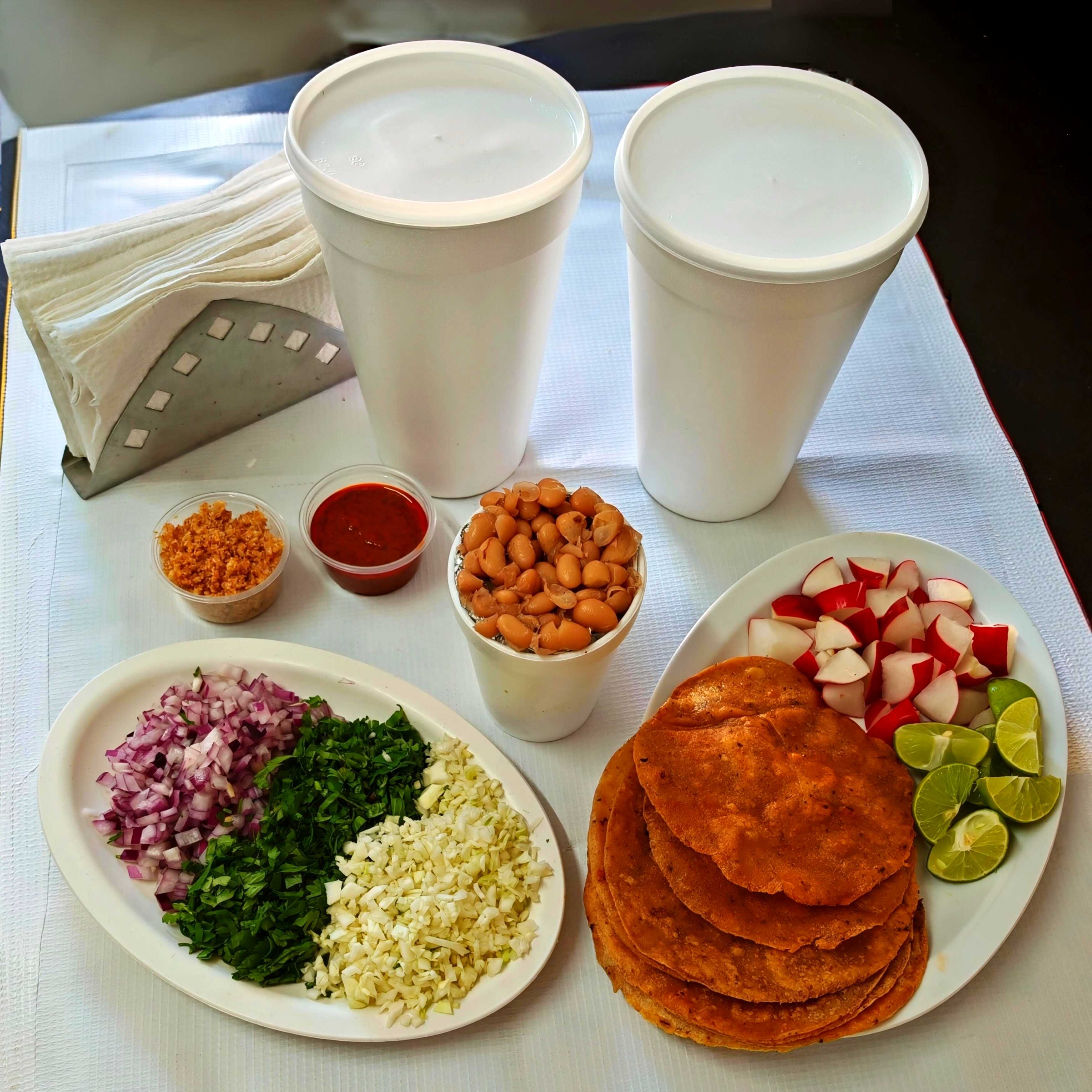 Carne en un vaso 32oz y uno de jugo 32oz,verdura,limones,salsa, frijoles en teros, chicharrón y tortillas.