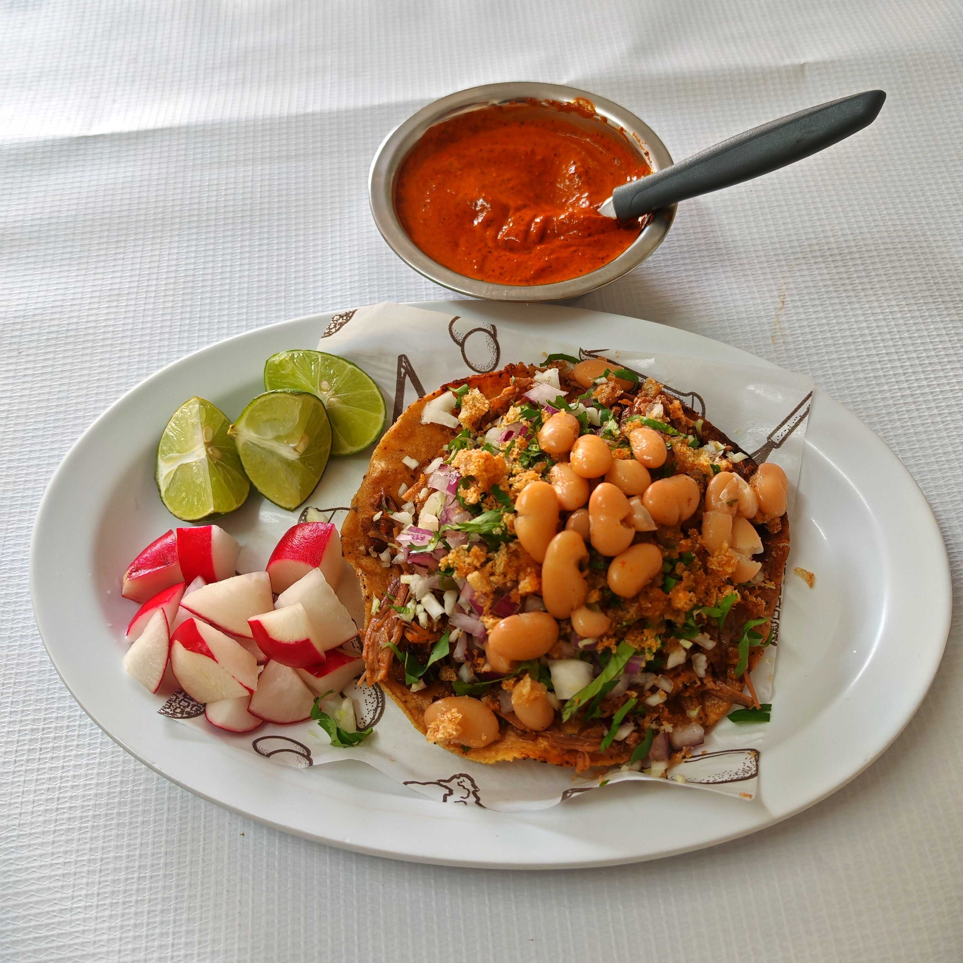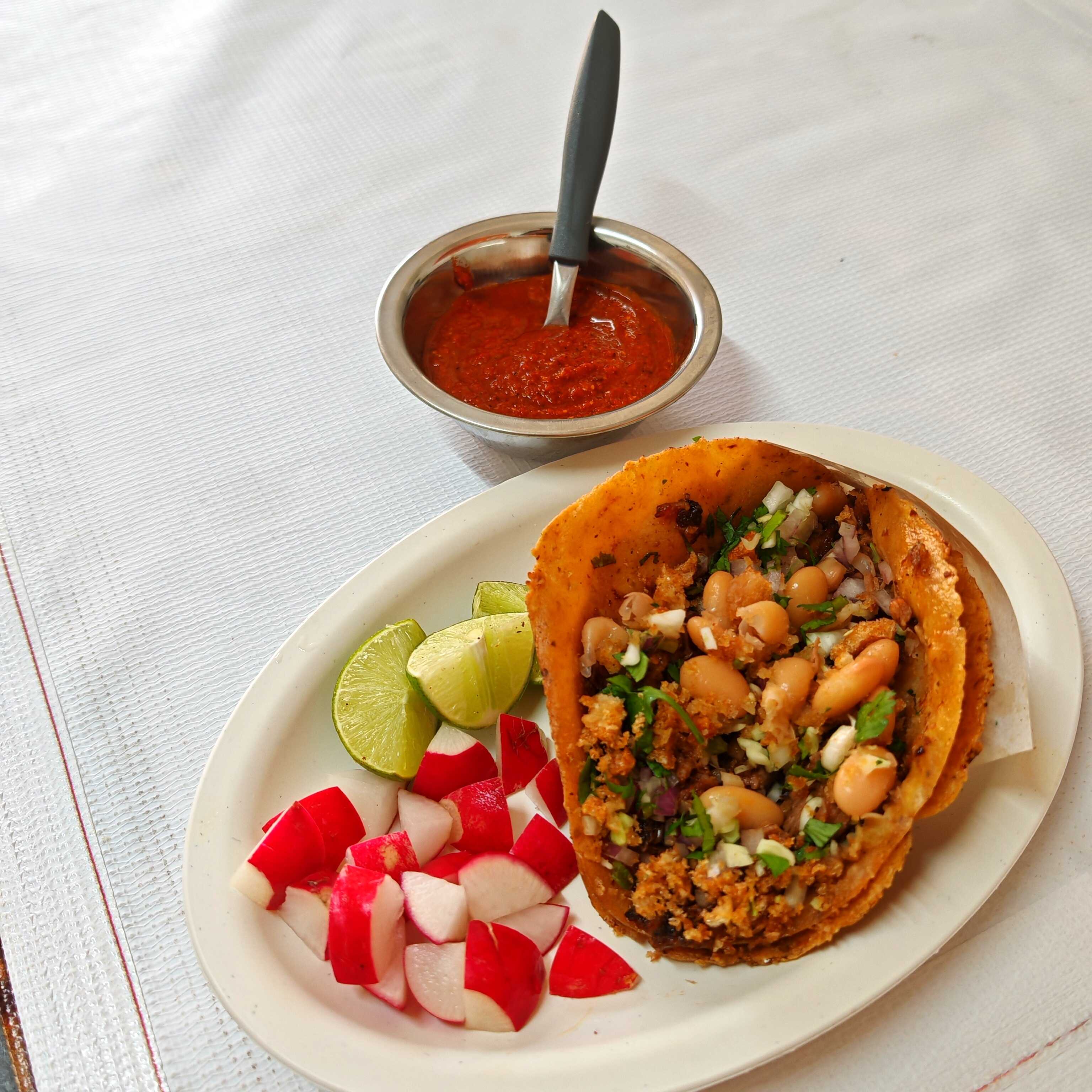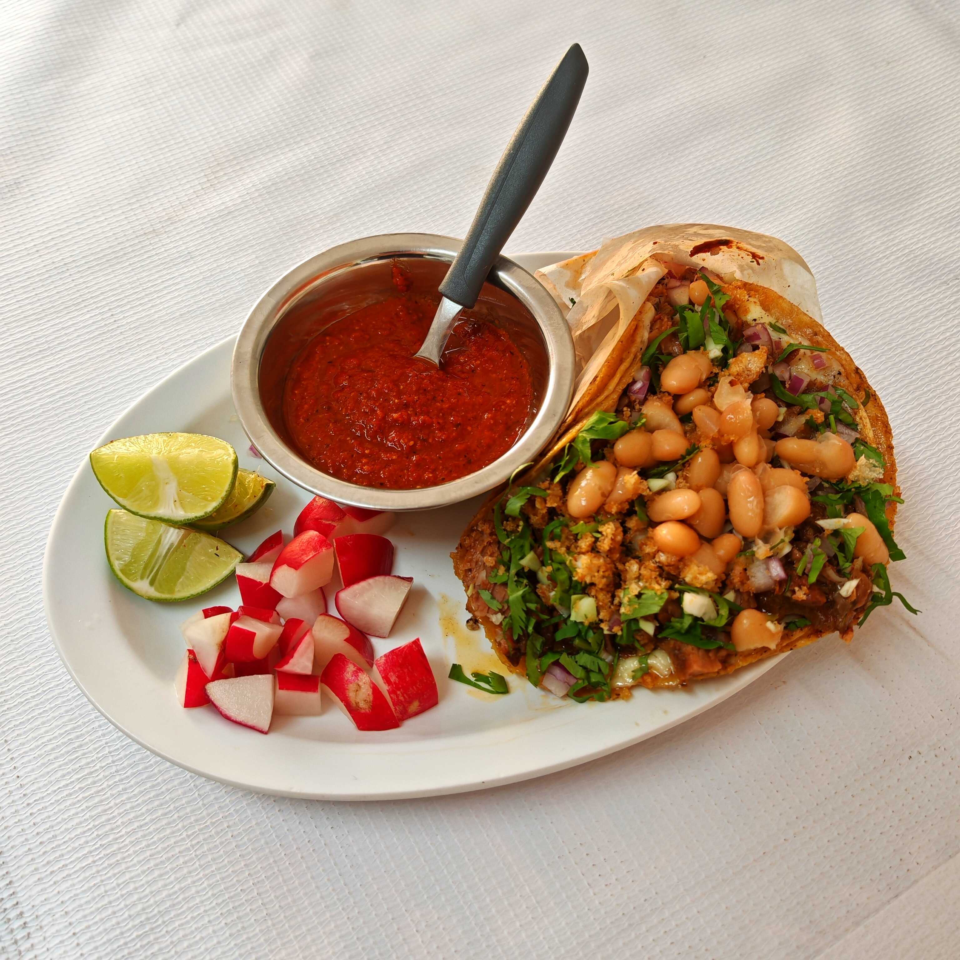 Carne,verdura, flijoles enteros y chicharrón,salsa.