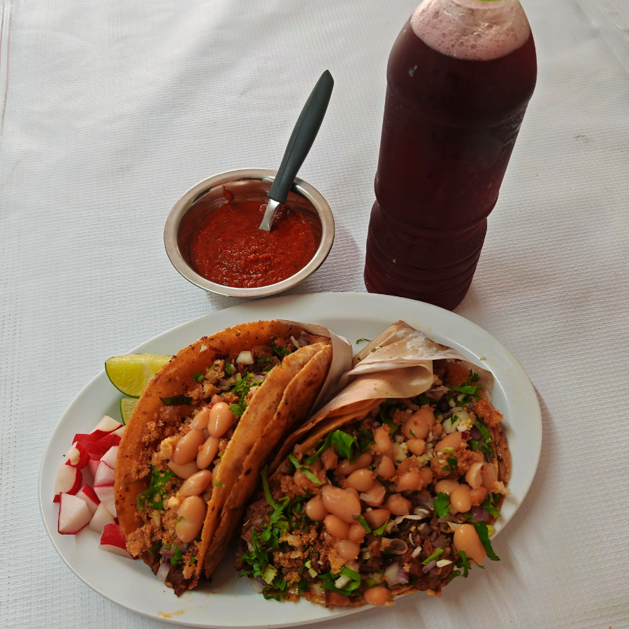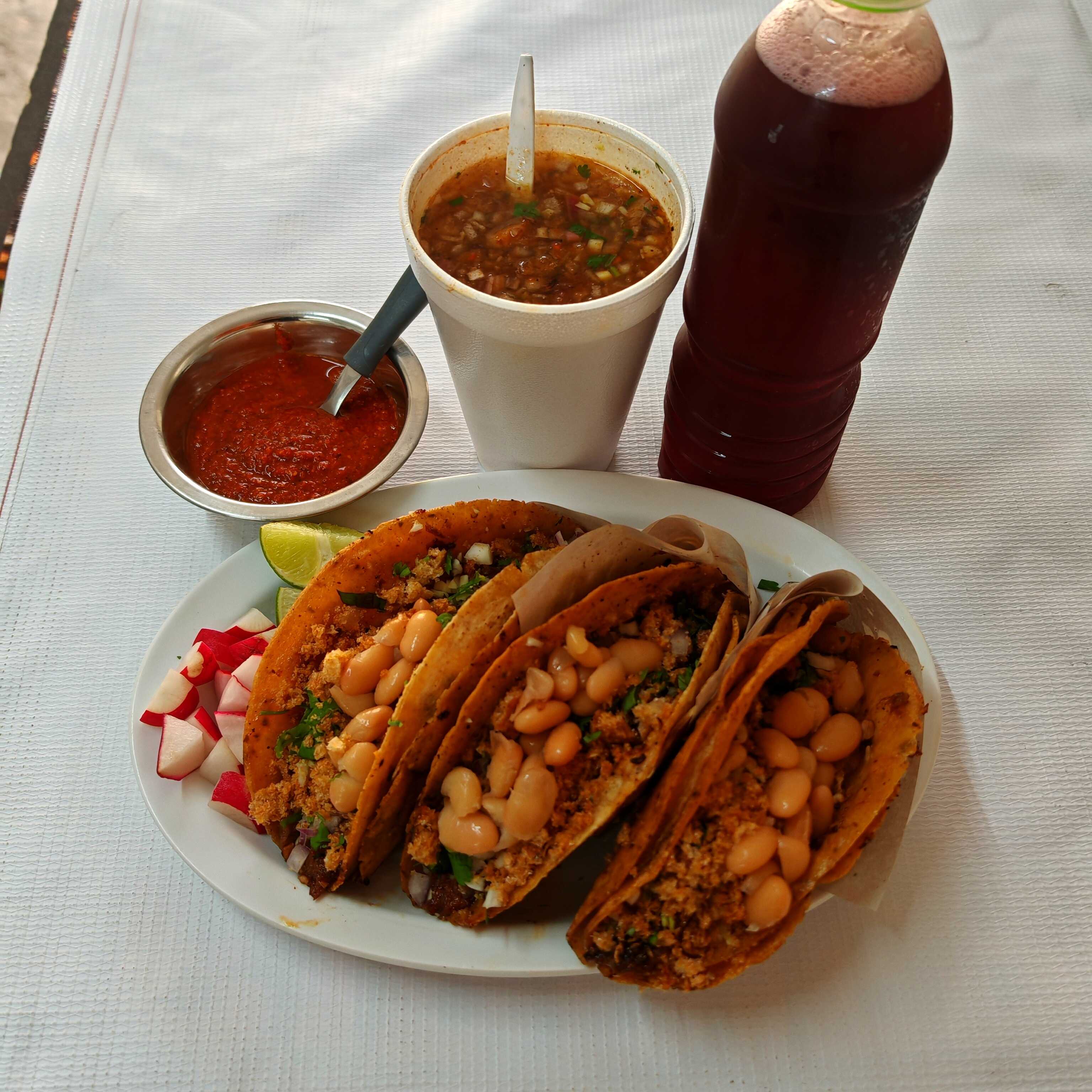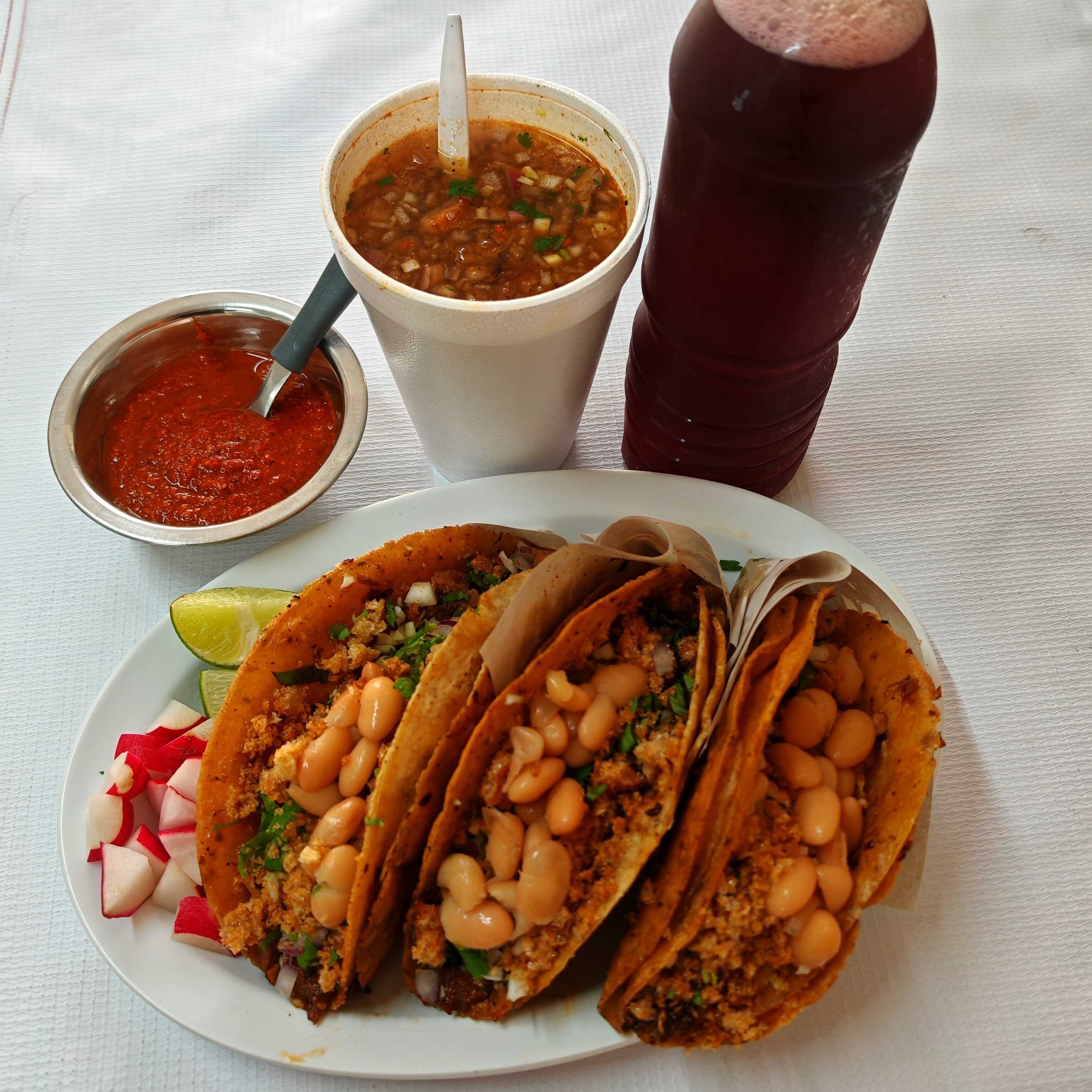 3 Tacos, 1 peñafiel 400oz y un vichi gratis