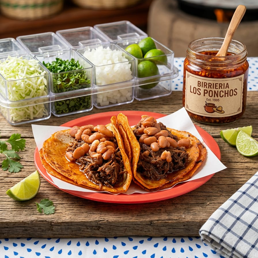 DOS QUESABIRRIAS CON COSTRA DE QUESO ALA PLANCHA Y VASO DE. CONSOME DE 12 onz. CON CEBOLLA,REPOLLOY CILANTRO , SALSA DE CHILE DE ARBOL