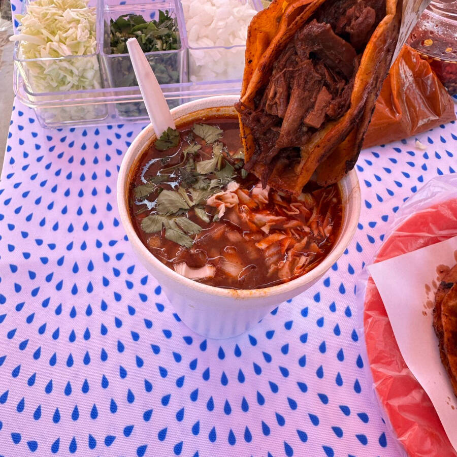 VASO DE BIRRIA CON CARNE Y TACO DORADO