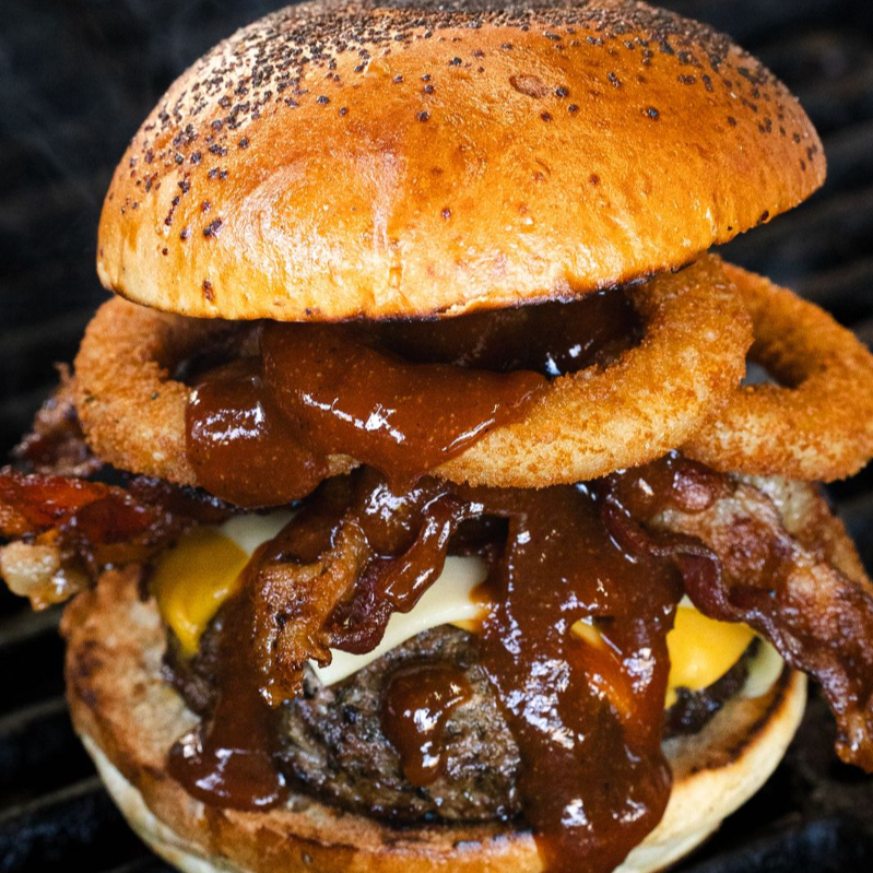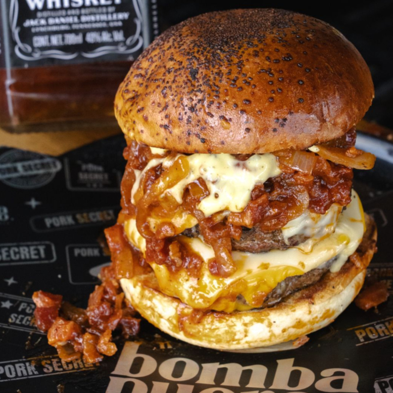 Hamburguesa con tocinito crjujiente, cebolla caramelizada y un toque de bebida de etiqueta negra que le da un sabor intenso y único.