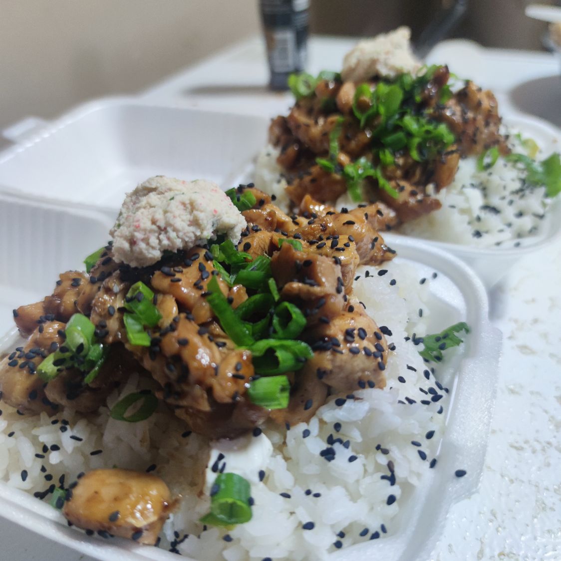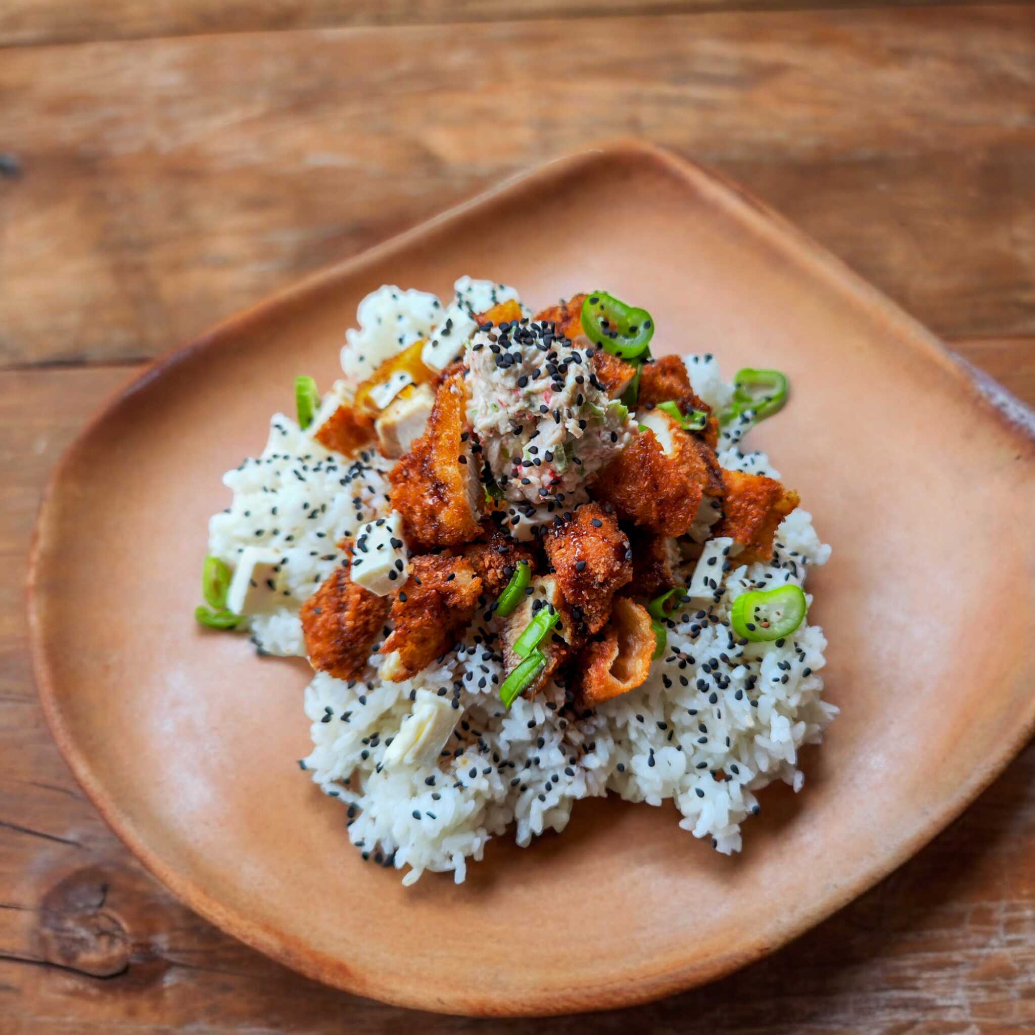 Pollo bañado en salsa de la casa, acompañado de arroz al vapor, queso crema y ajonjolí.