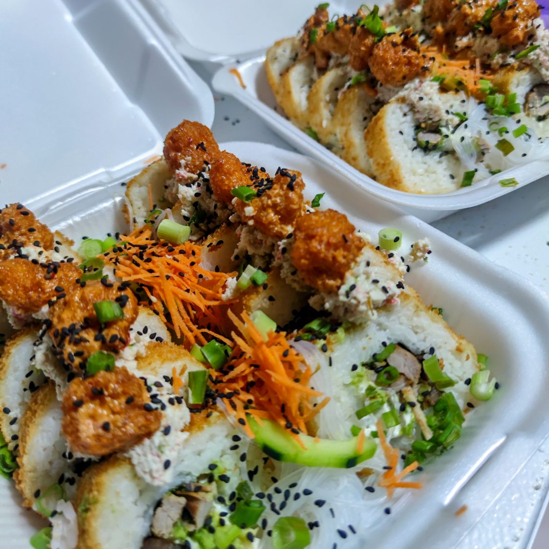 2 sushibolas mixtas por dentro pollo, res , aguacate y pepino , empanizadas.