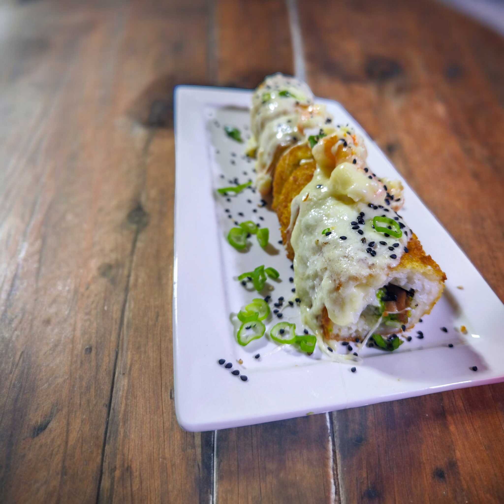 Relleno de queso crema, aguacate, tocino, camarón cocido, por fuera en tempura, encima tampico, ajonjolí y cebollín.