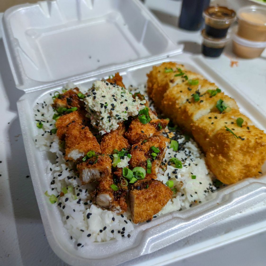 1 Gohan Especial, arroz, queso crema , aguacate, Tampico y cebollín + 1/2 Rollo empanizado, queso crema, aguacate, pepino y pollo.
