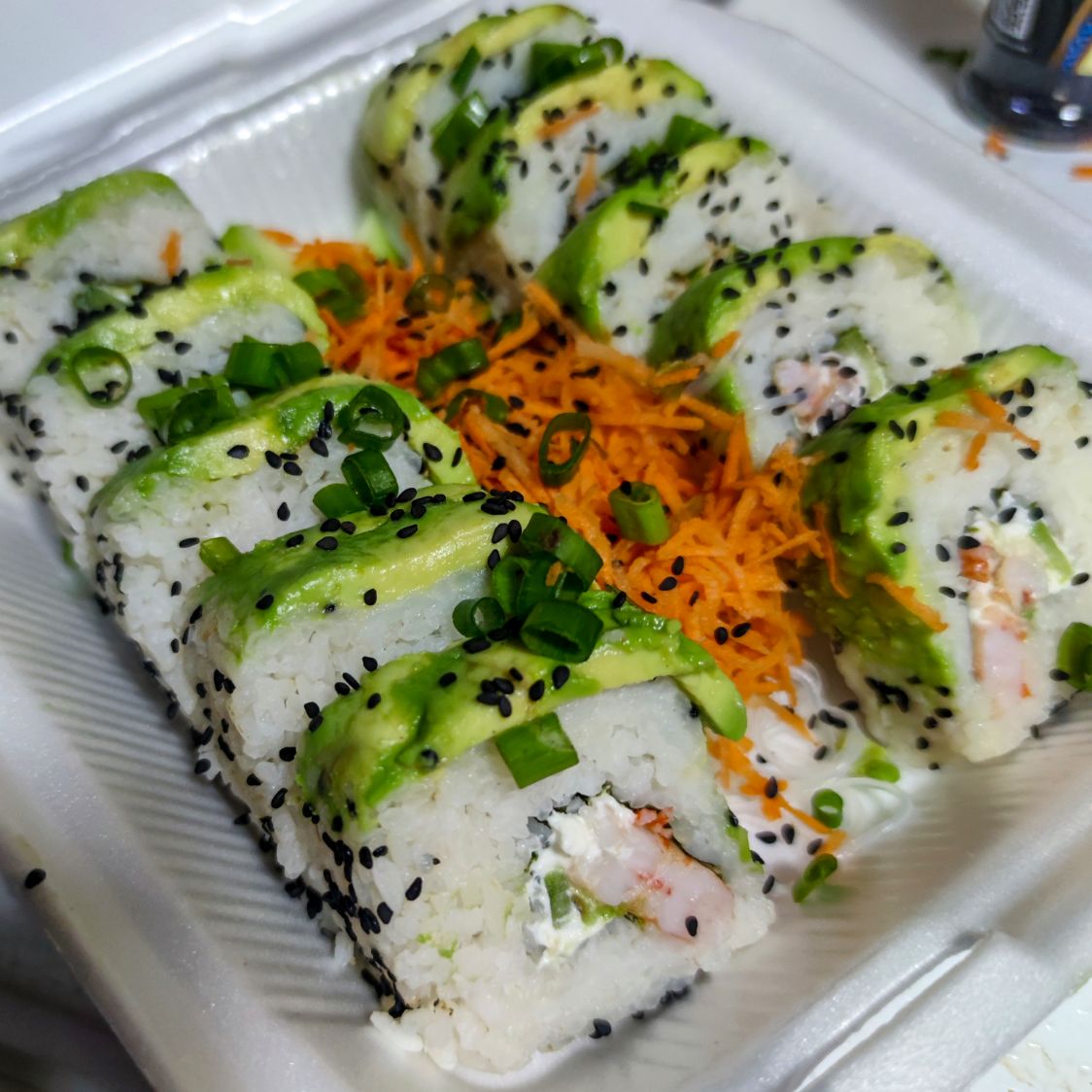 Releno de queso crema, pepino, aguacate y camarón, forrado de aguacate y ajonjolí.