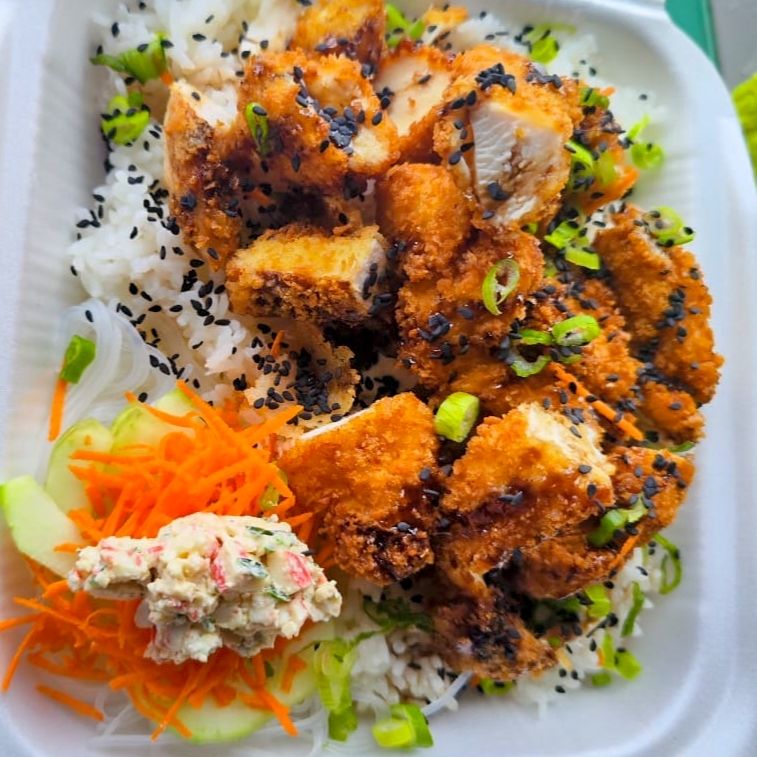 Pechuga de pollo enpanizada, encima salsa de anguila, queso crema, acompañada con arroz al vapor, ajonjolí, cebollín y tampico encima.
