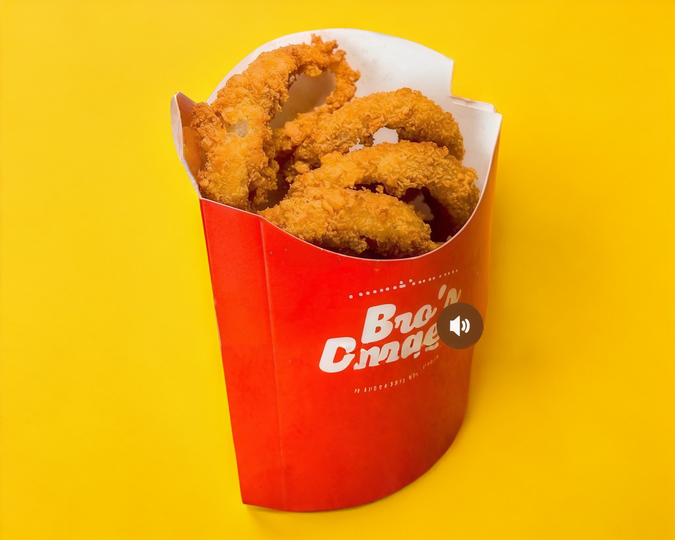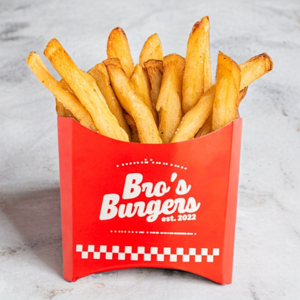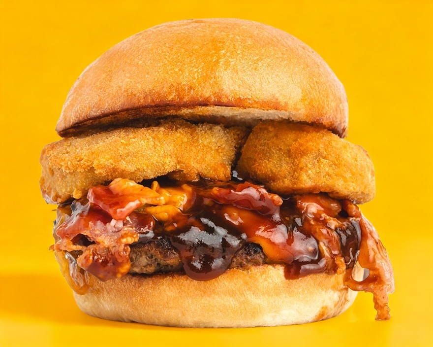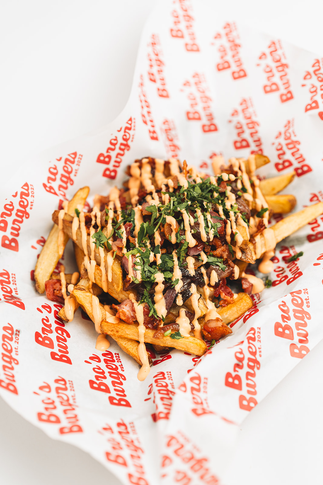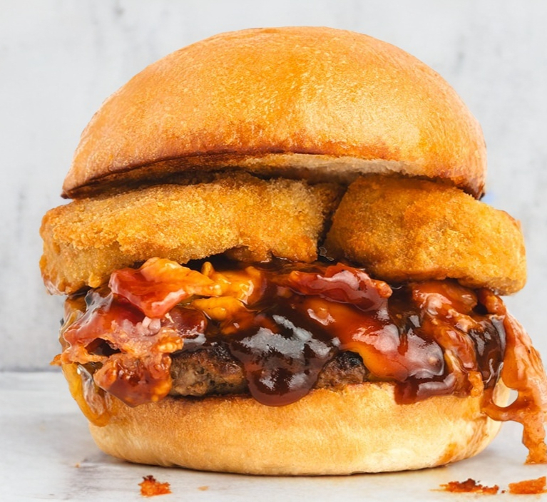Aderezo bros, carne hecha en casa .180gr en crudo, queso americano, bbq, tocino y aros de cebolla. Incluye catsup y servilletas.