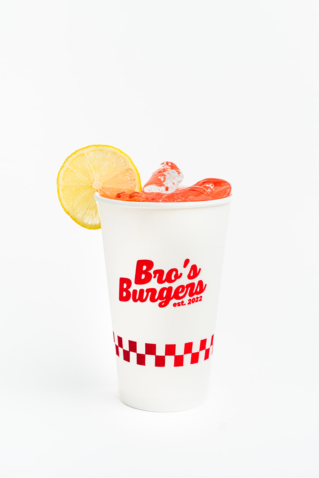 Aderezo Bros, Carne Hecha en casa .180gr en crudo, Queso Americano, lechuga, tomate y cebolla. +limonada 16oz + papas md. Incluye catsup y servilletas