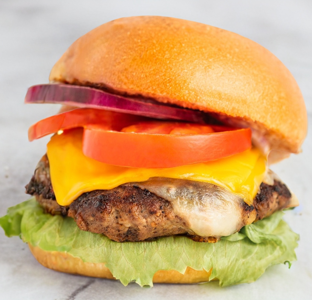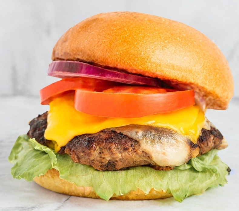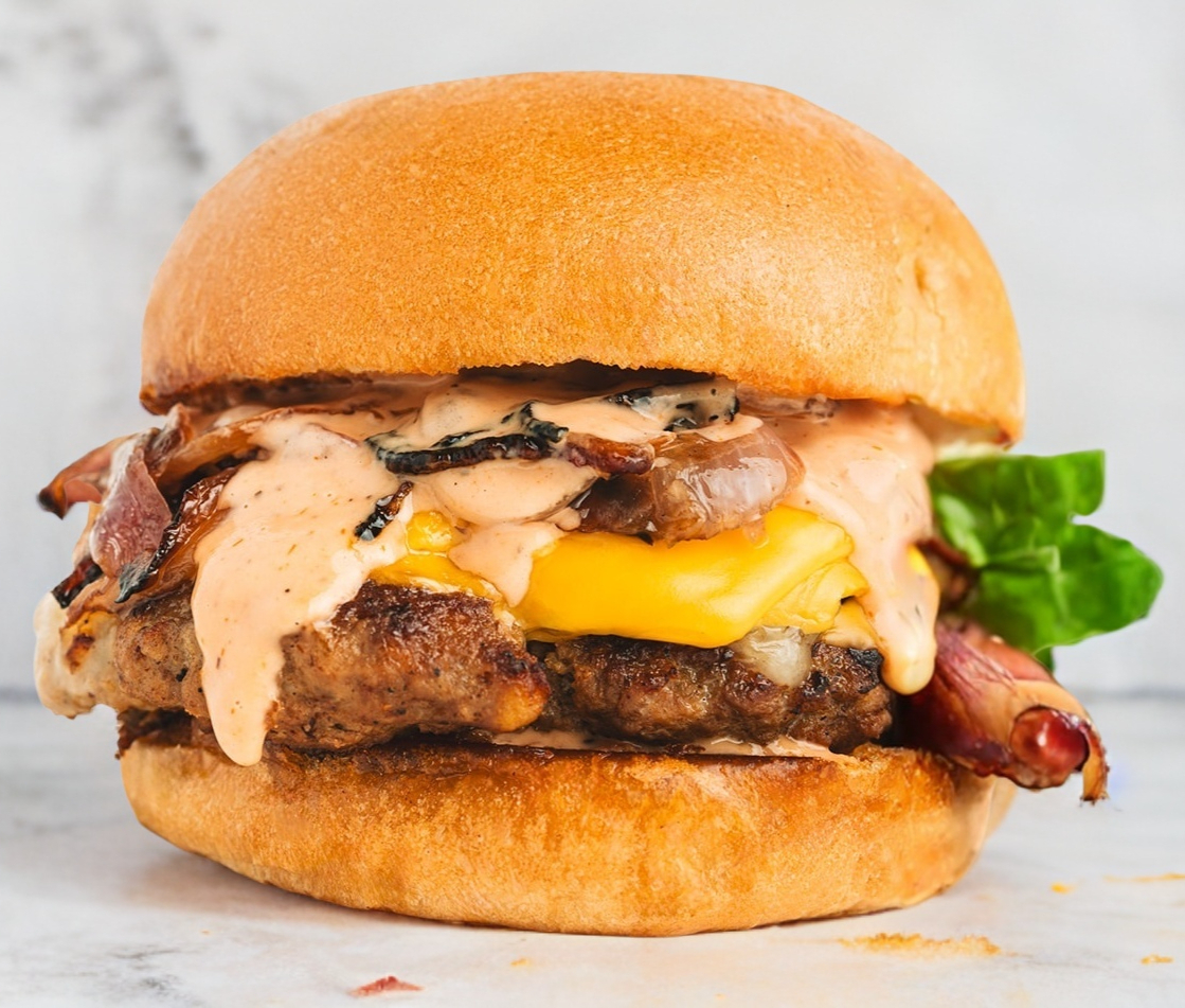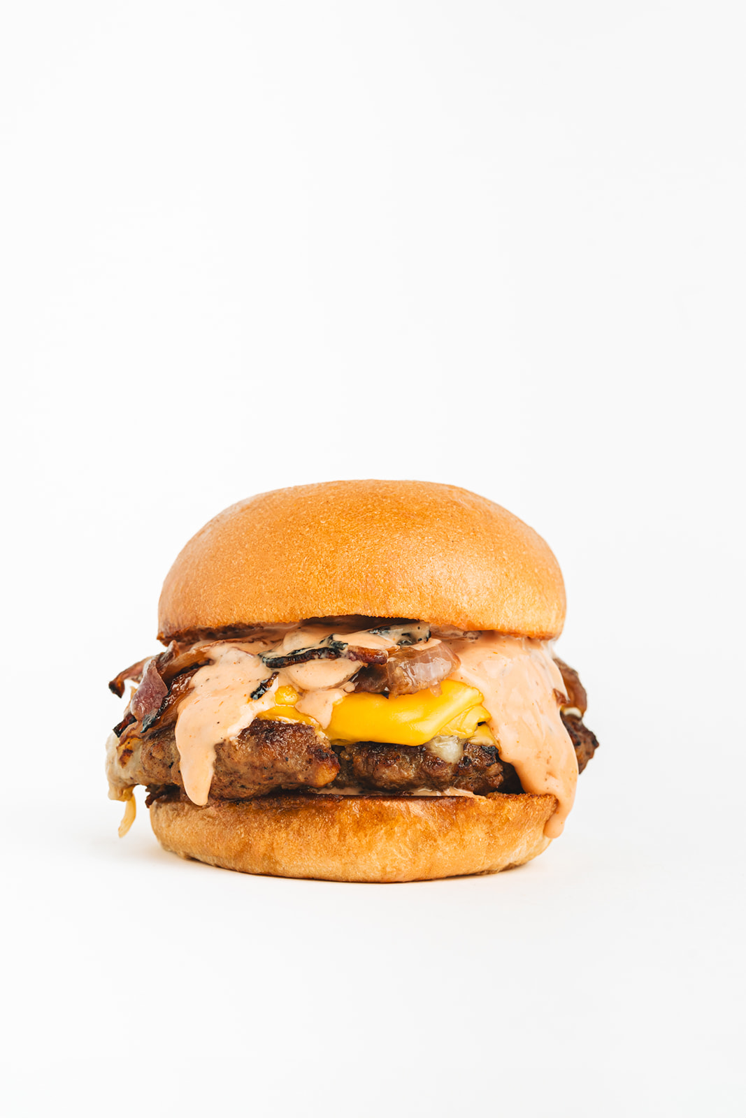 Aderezo bros, carne hecha en casa .180gr en crudo, doble queso americano, y cebolla caramelizadas. Incluye catsup y servilletas.