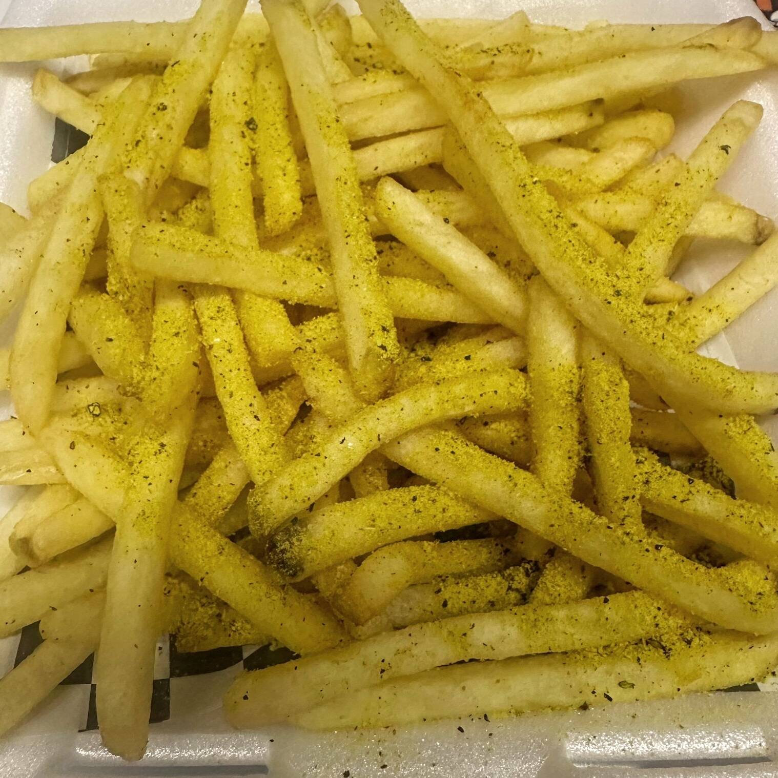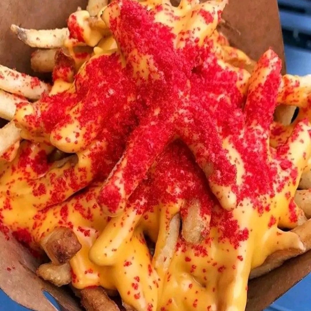 Orden de papas bañadas en queso con polvo de chetos flaming