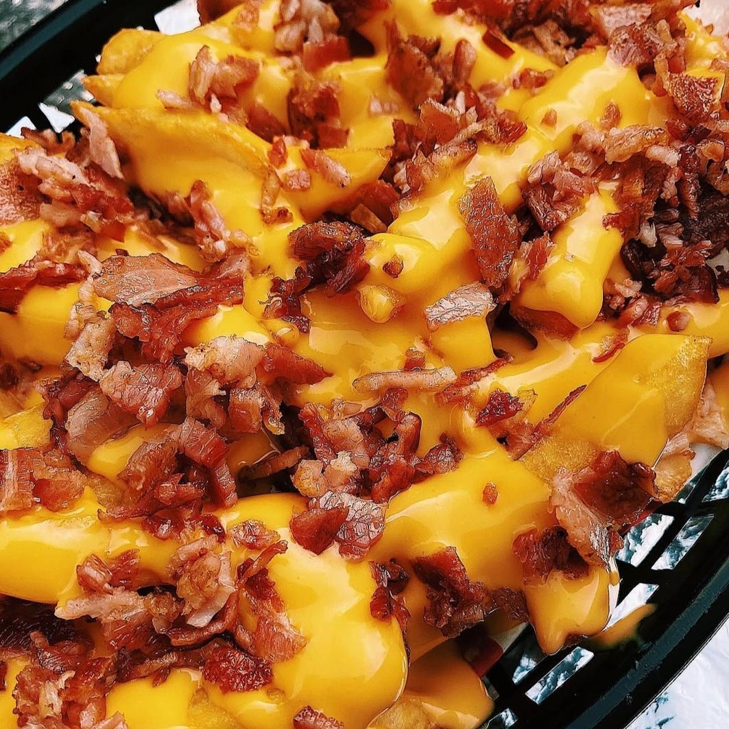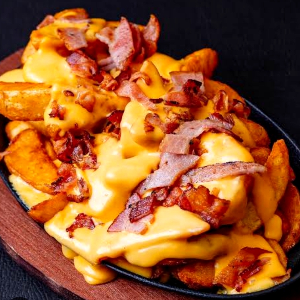 Carne queso, tomate,lechuga,cebollita asada, bañada en queso y tocino incluye 1/2 orden de papas