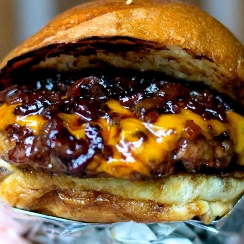 Carne de res ,queso, mermelada dulce de tocino, cebolla caramelizada mayonesa mostaza y ketchup