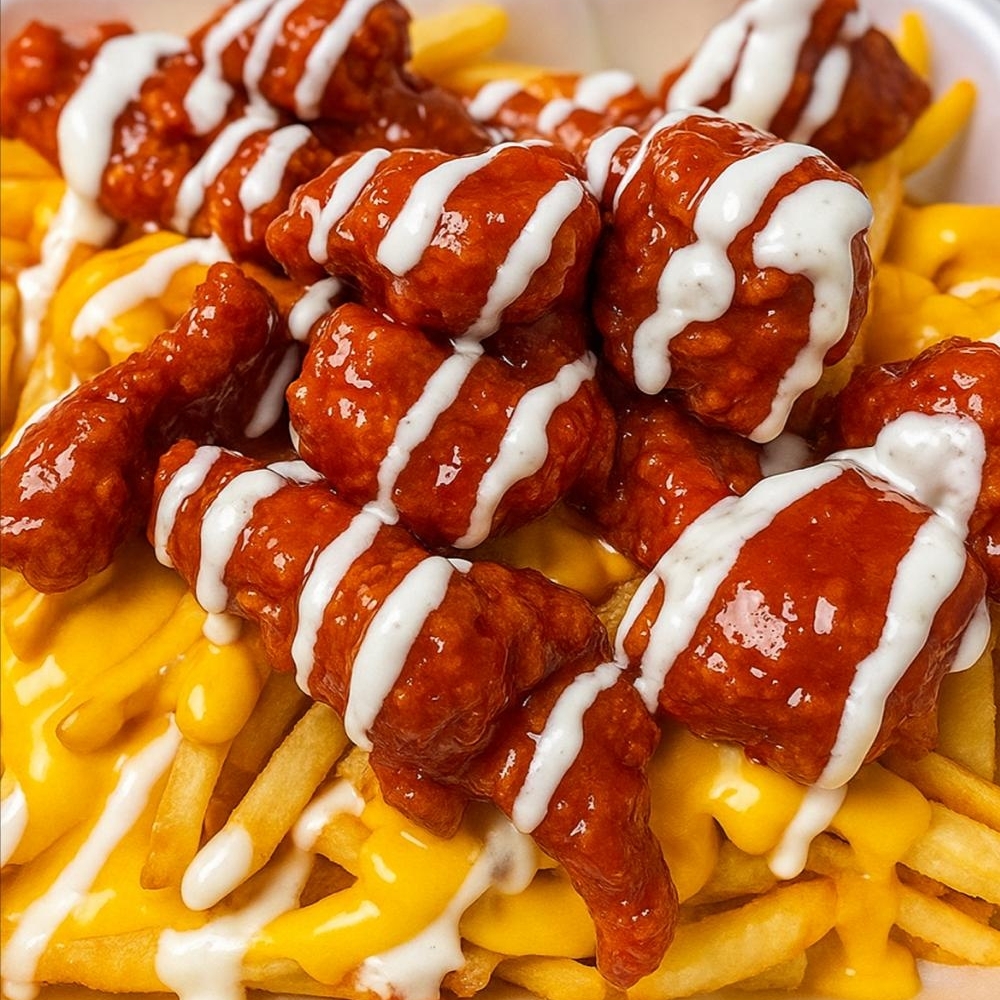Cama de papas fritas queso 1/2 orden de boneless bañados en salsa al gusto
