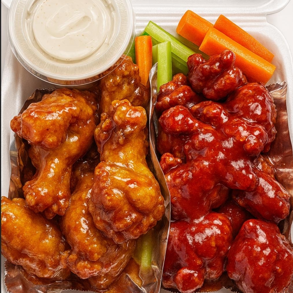 Media orden de alitas( 6piezas) bañadas en 1 salsa a elección con Media orden de papas (150 gramos)