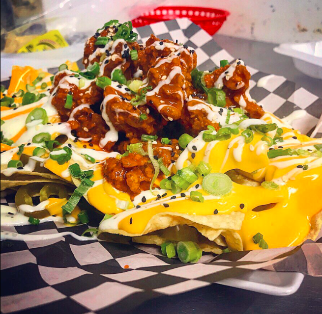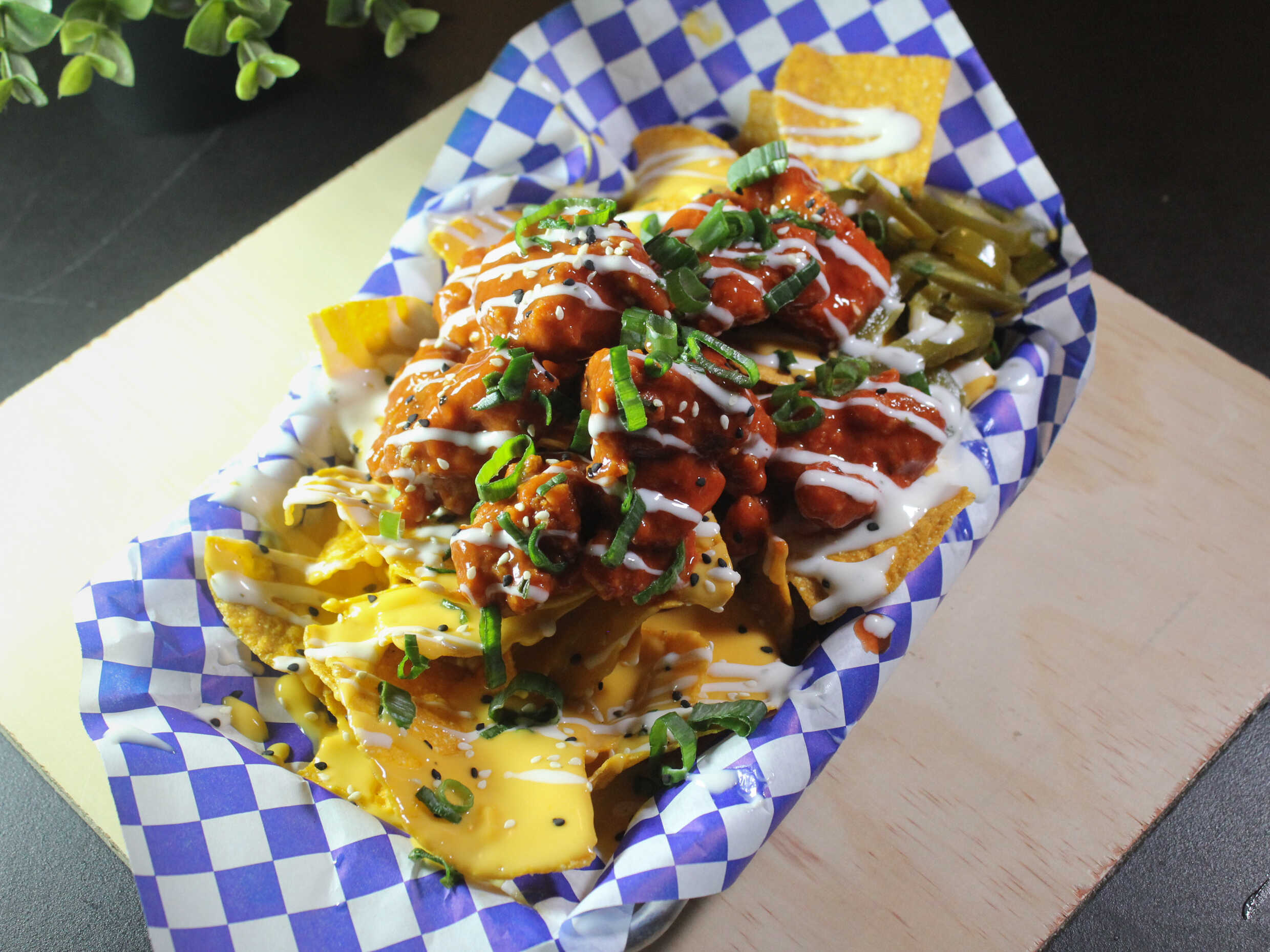 Uno de los platillos de la casa. Totopos con queso, boneless, ranch y cebollín.