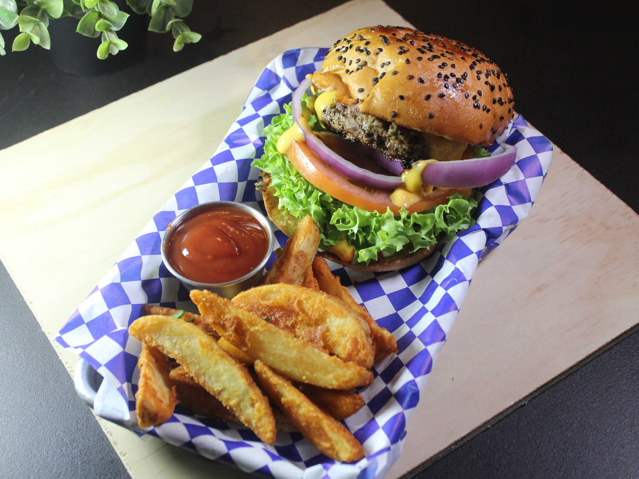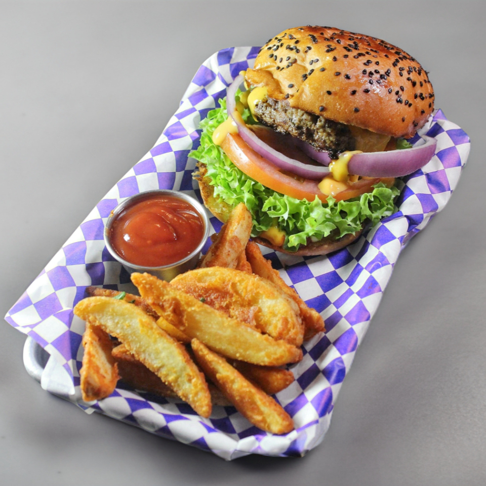 (160grs) Carne (nuestra receta), queso cheddar, lechuga, tomate, cebolla y aderezos. Lo clásico jamás falla. Te recomendamos agregar papas.