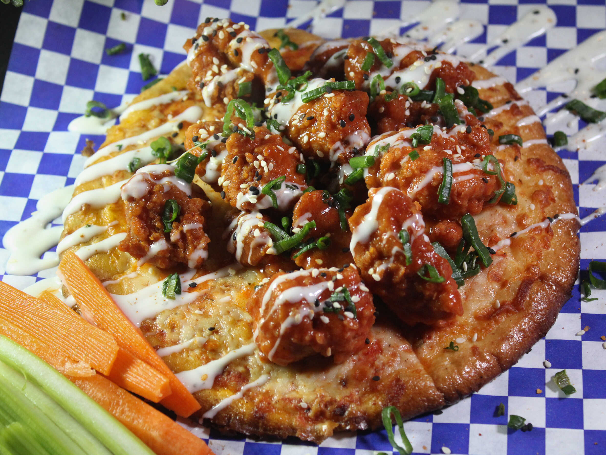Pizza personal por encima boneless de tu salsa favorita con ranch y cebollin.