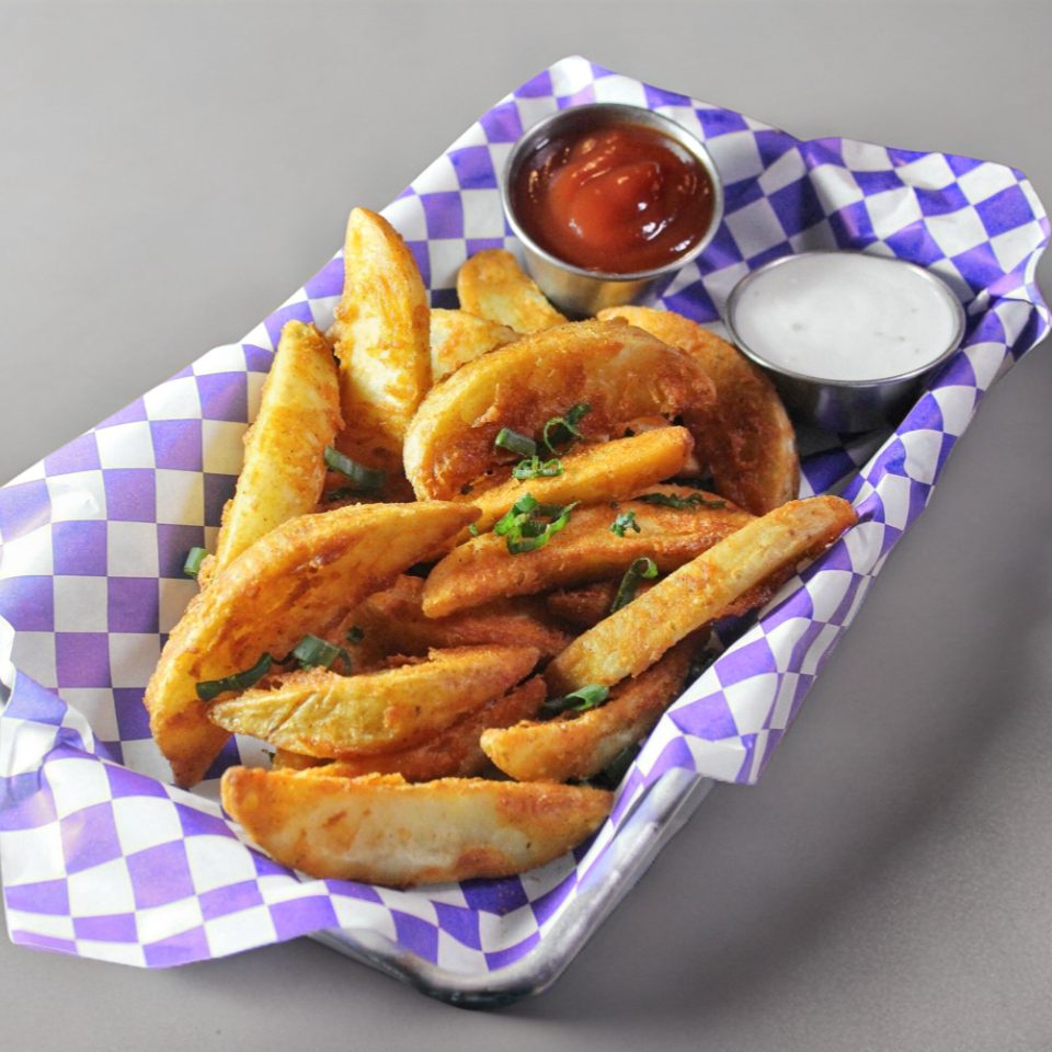 Papas gajo sazonadas o francesas, con queso, ranch y cebollín. Ideales como complemento.
