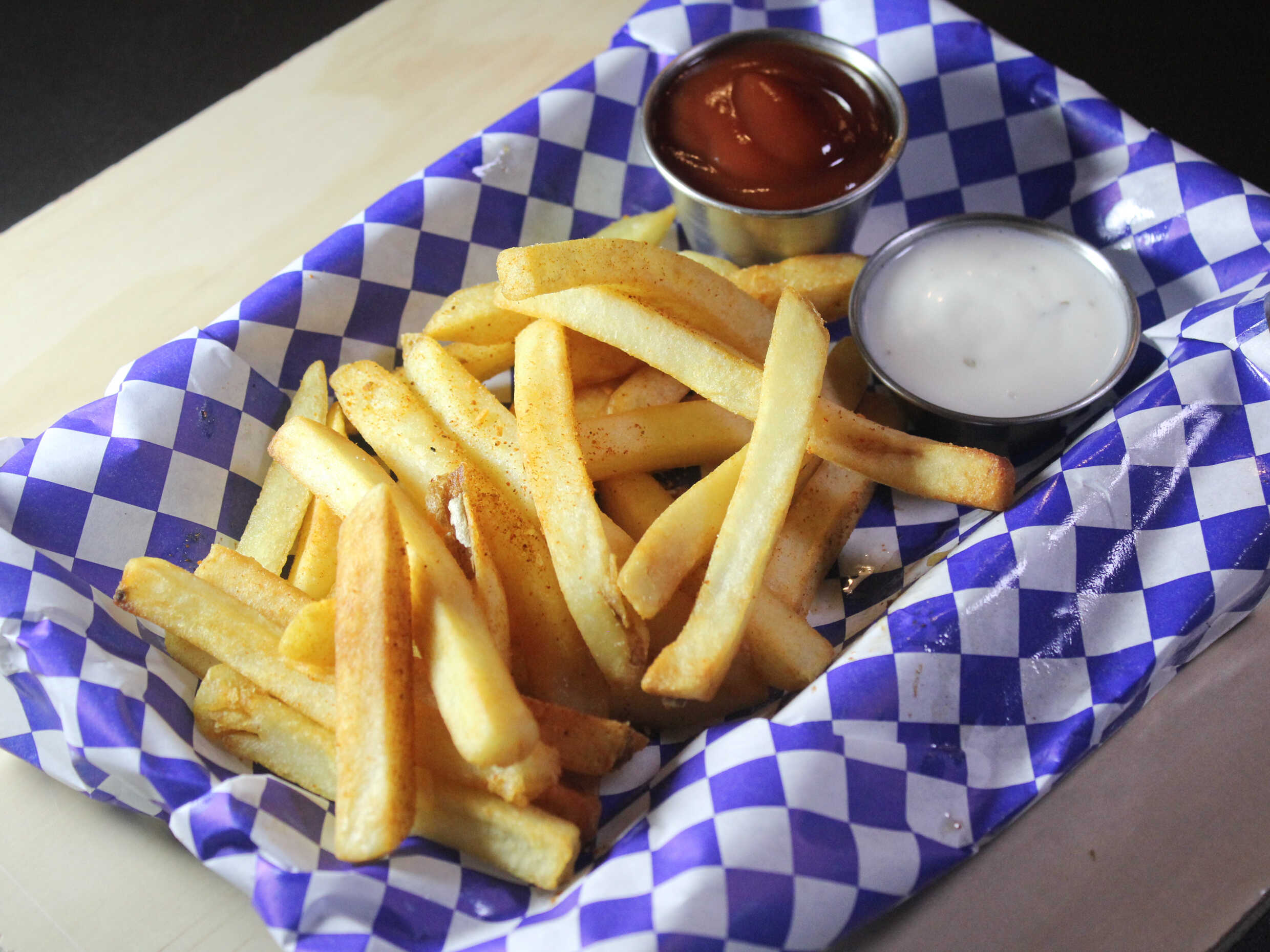 Papas gajo o a la francesa, ranch, carne o pollo, cebollín y ajonjolí. ¡Tamaño grande ideal para compartir!