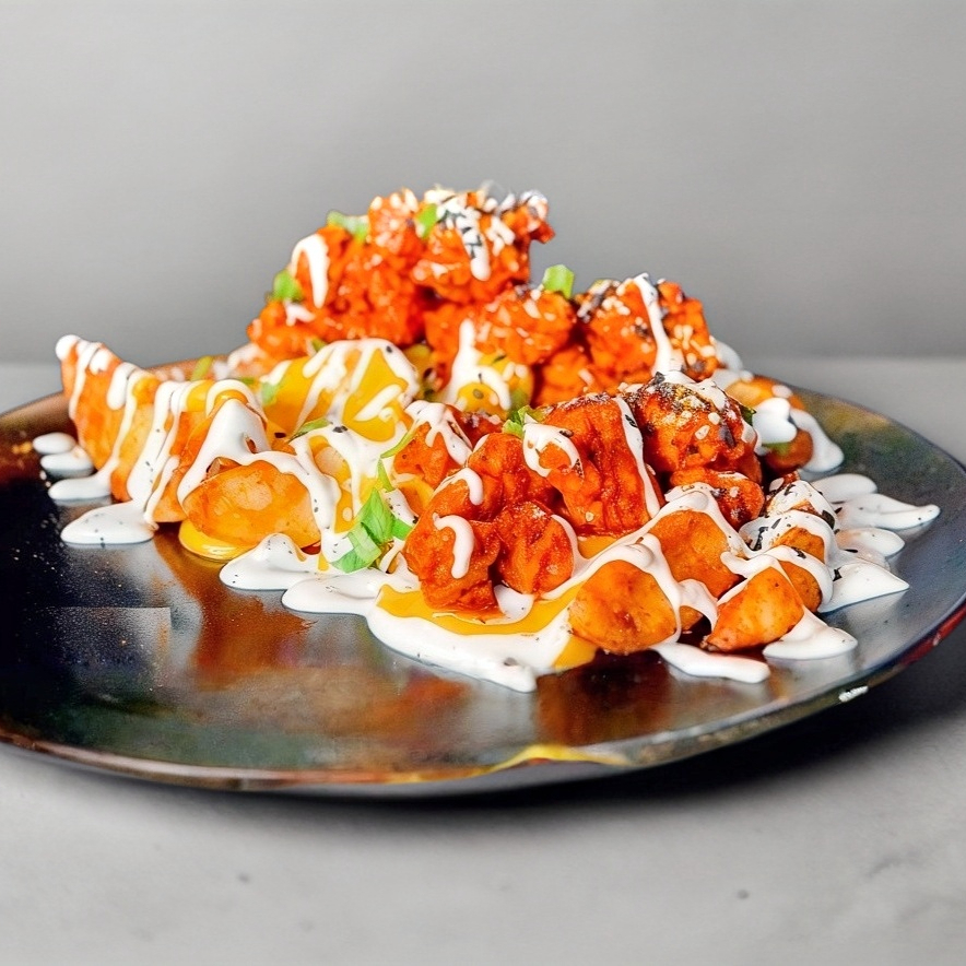 Nuestro platillo estrella desde 2015. Cama de papas gajo o francesas, queso, ranch, 200gr de boneless con tu salsa favorita, más ranch y cebollín. Chicas ideal para 1, Grandes para 2. NO INCLUYE RECIPIENTE DE RANCH